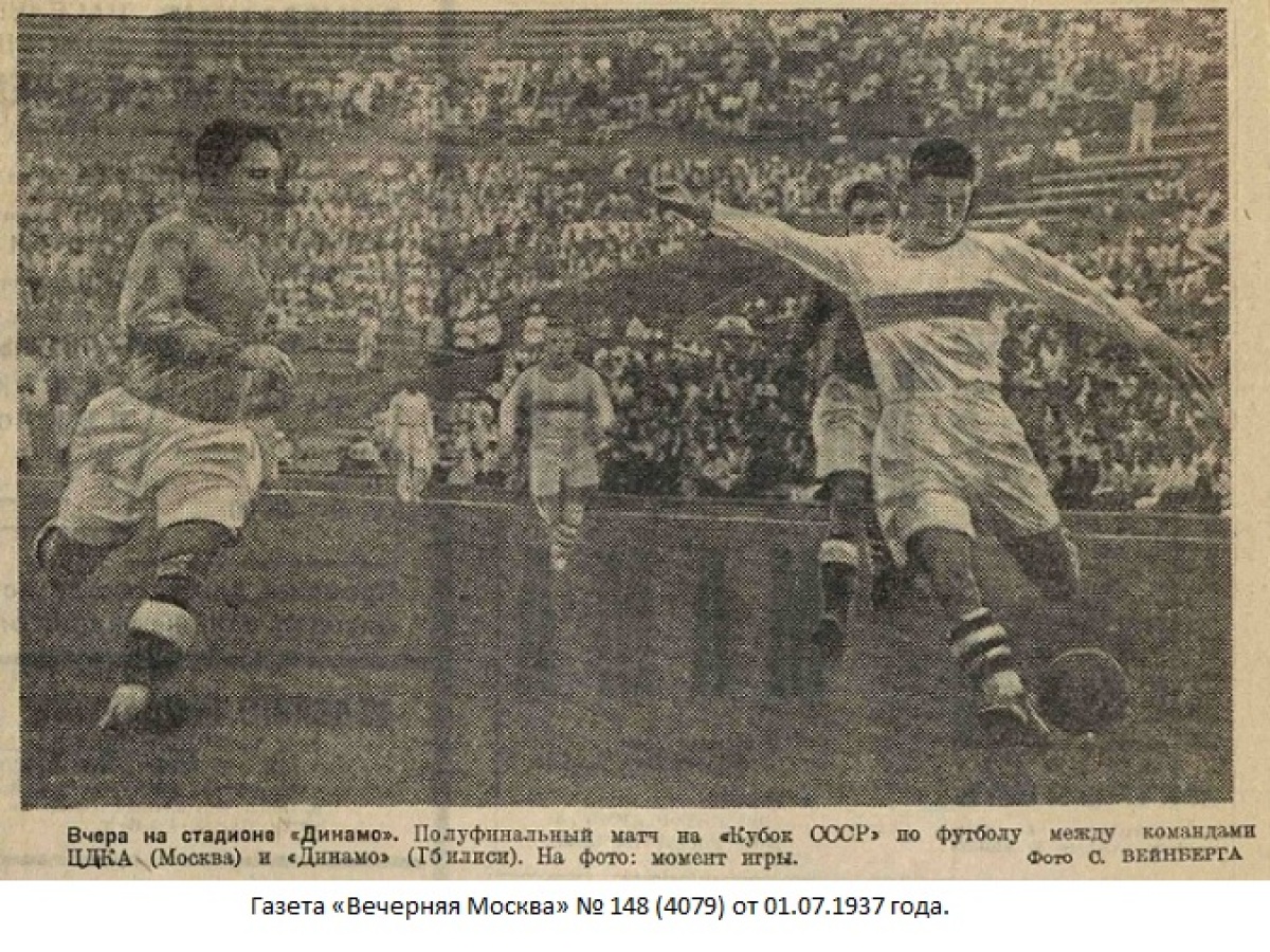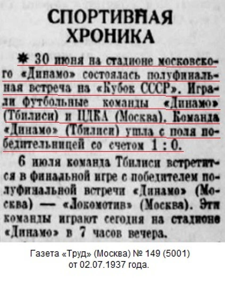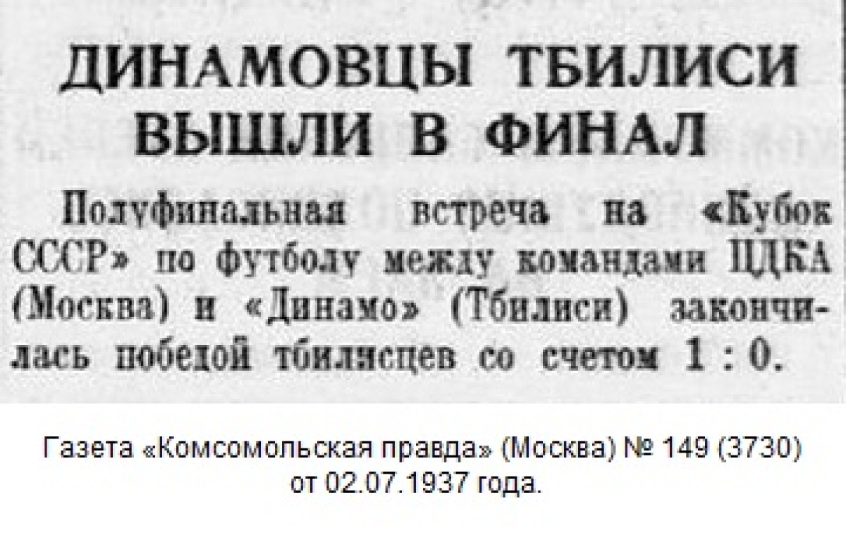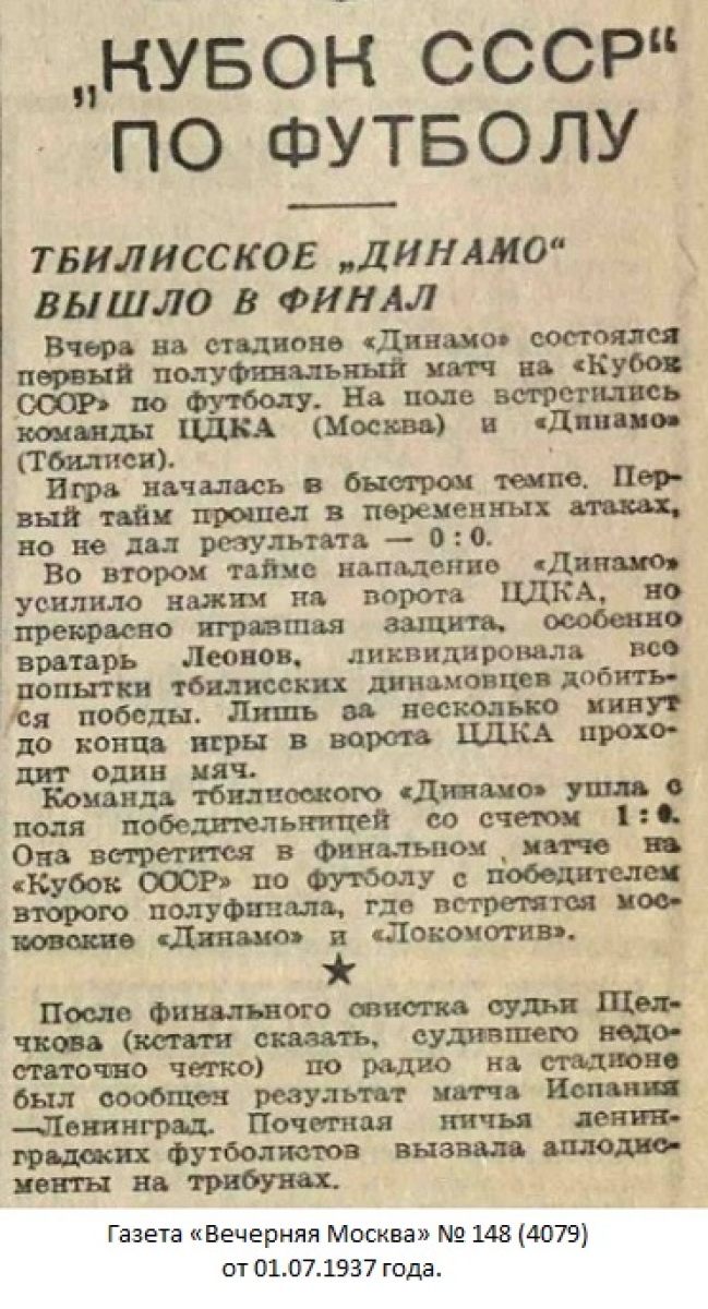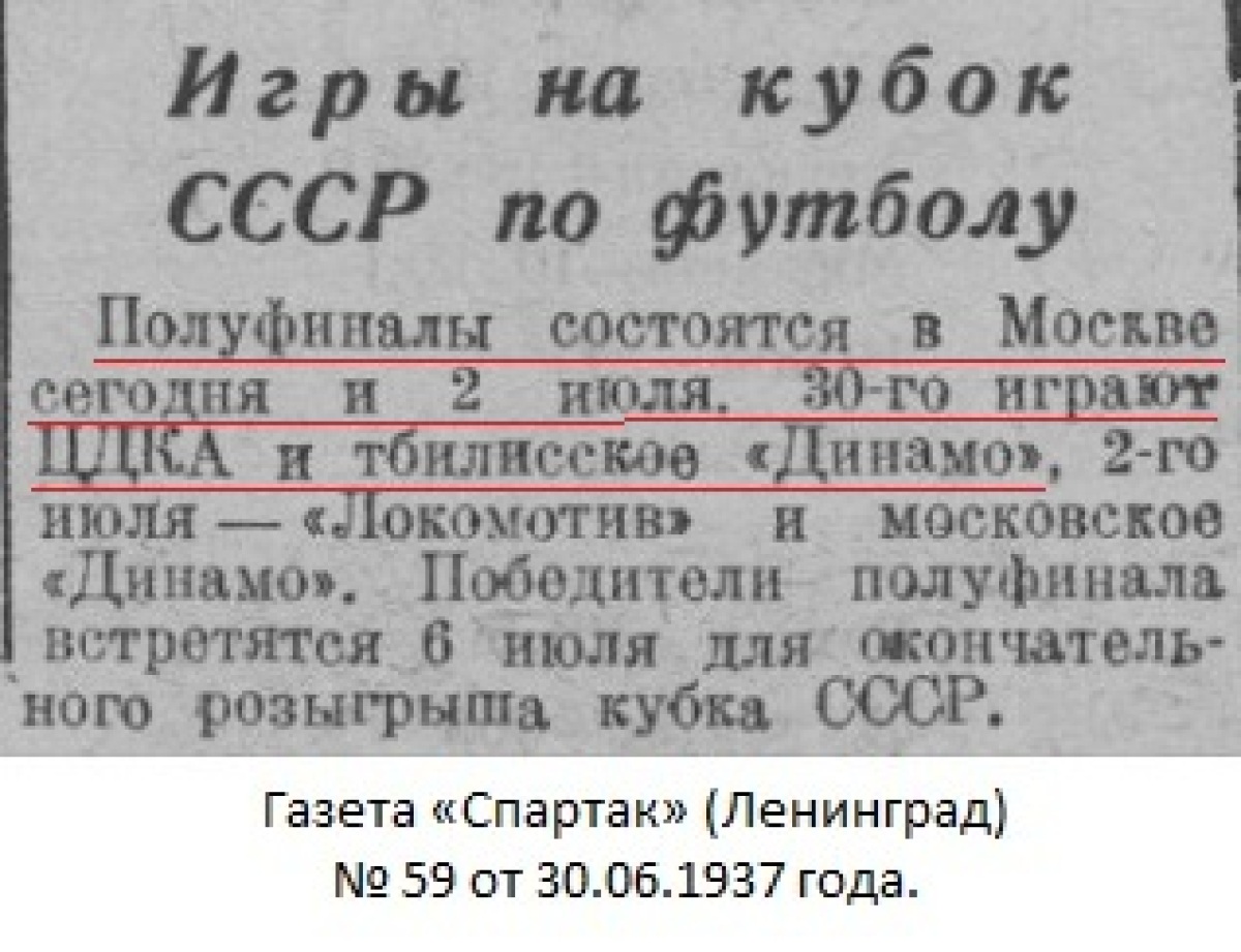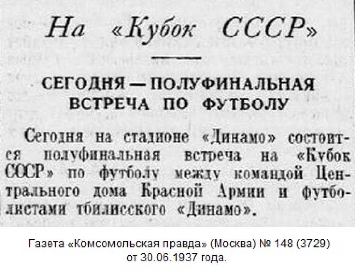 Комментарий. Начиная с 1/4 финала, все матчи Кубка СССР 1937 года проходили в Москве. Согласно жеребьевке хозяином поля в этом матче была команда «Динамо» (Тбилиси).