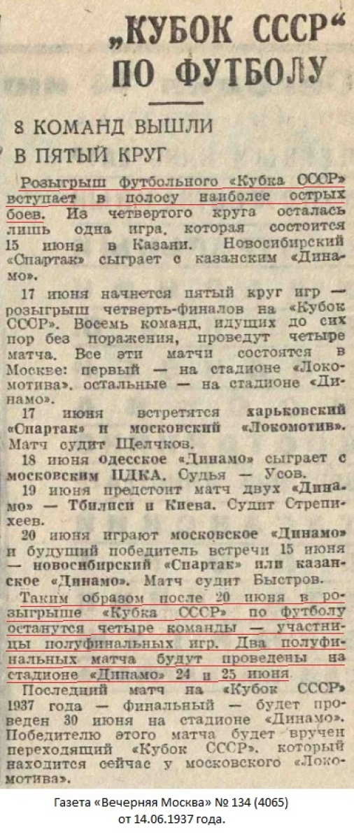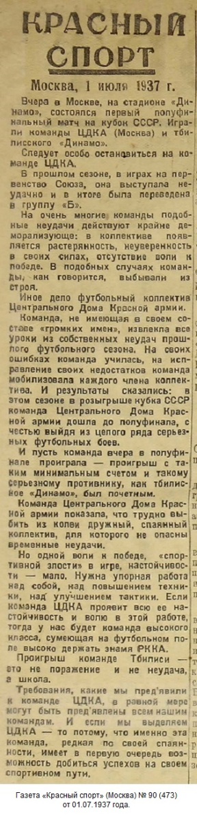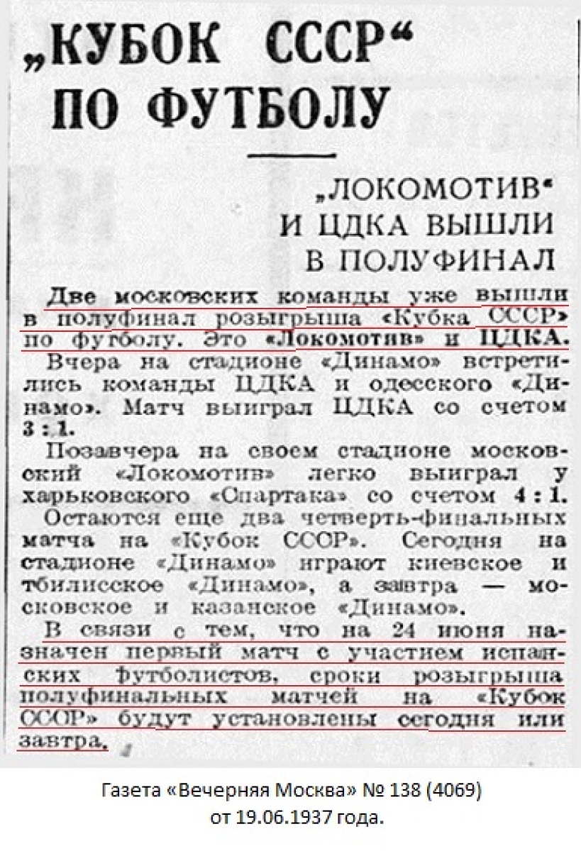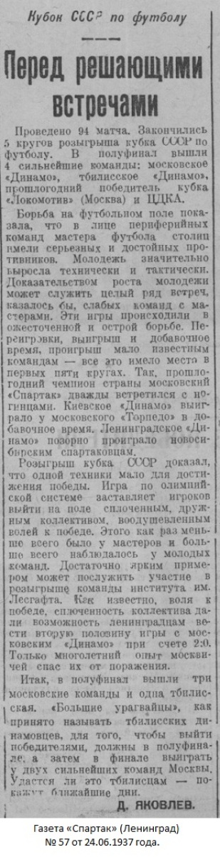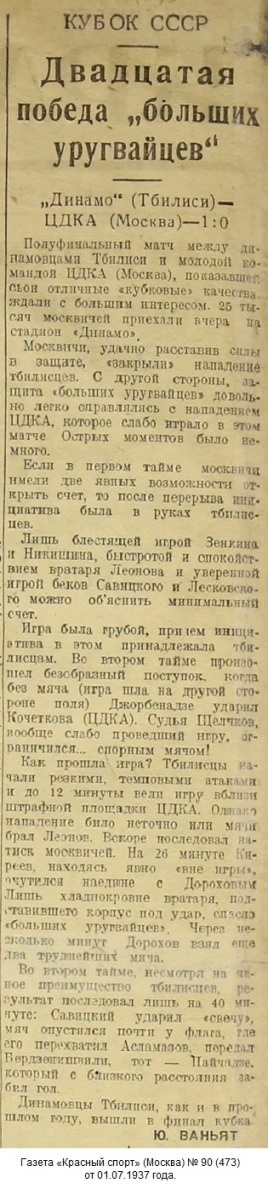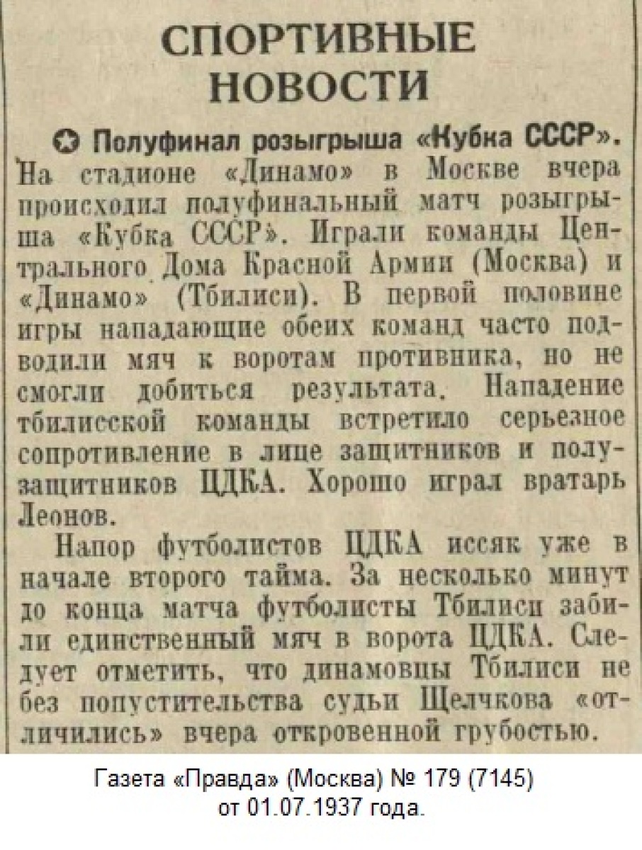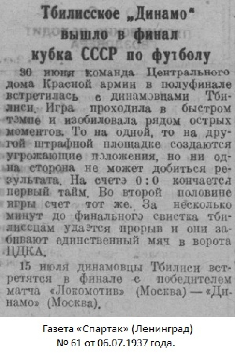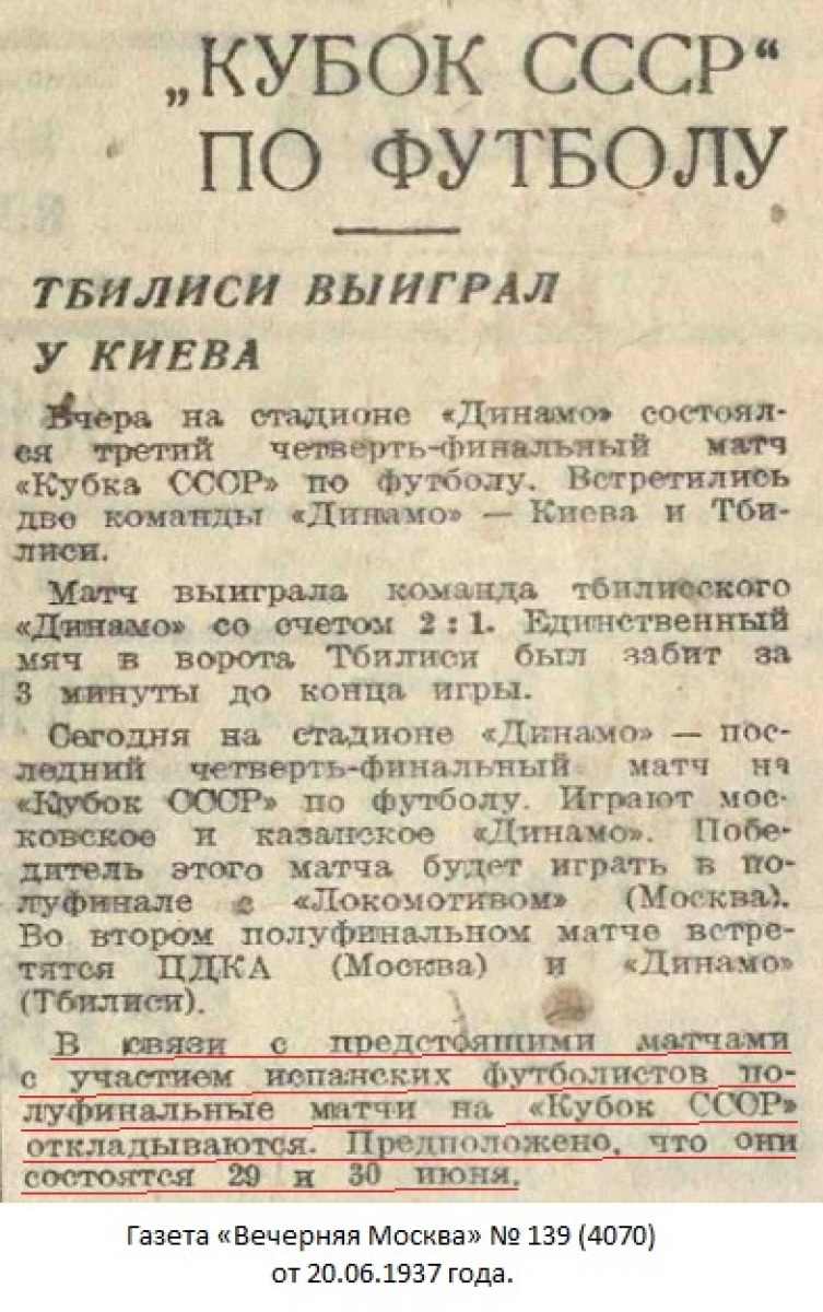 Комментарий. Начиная с 1/4 финала, все матчи Кубка СССР 1937 года проходили в Москве. Согласно жеребьевке хозяином поля в этом матче была команда «Динамо» (Тбилиси).