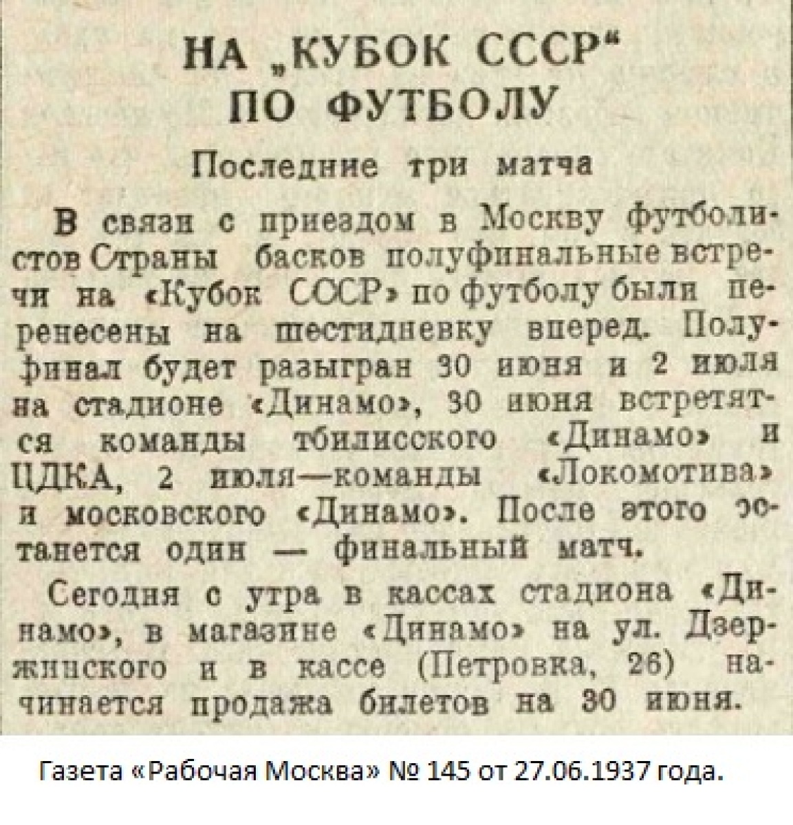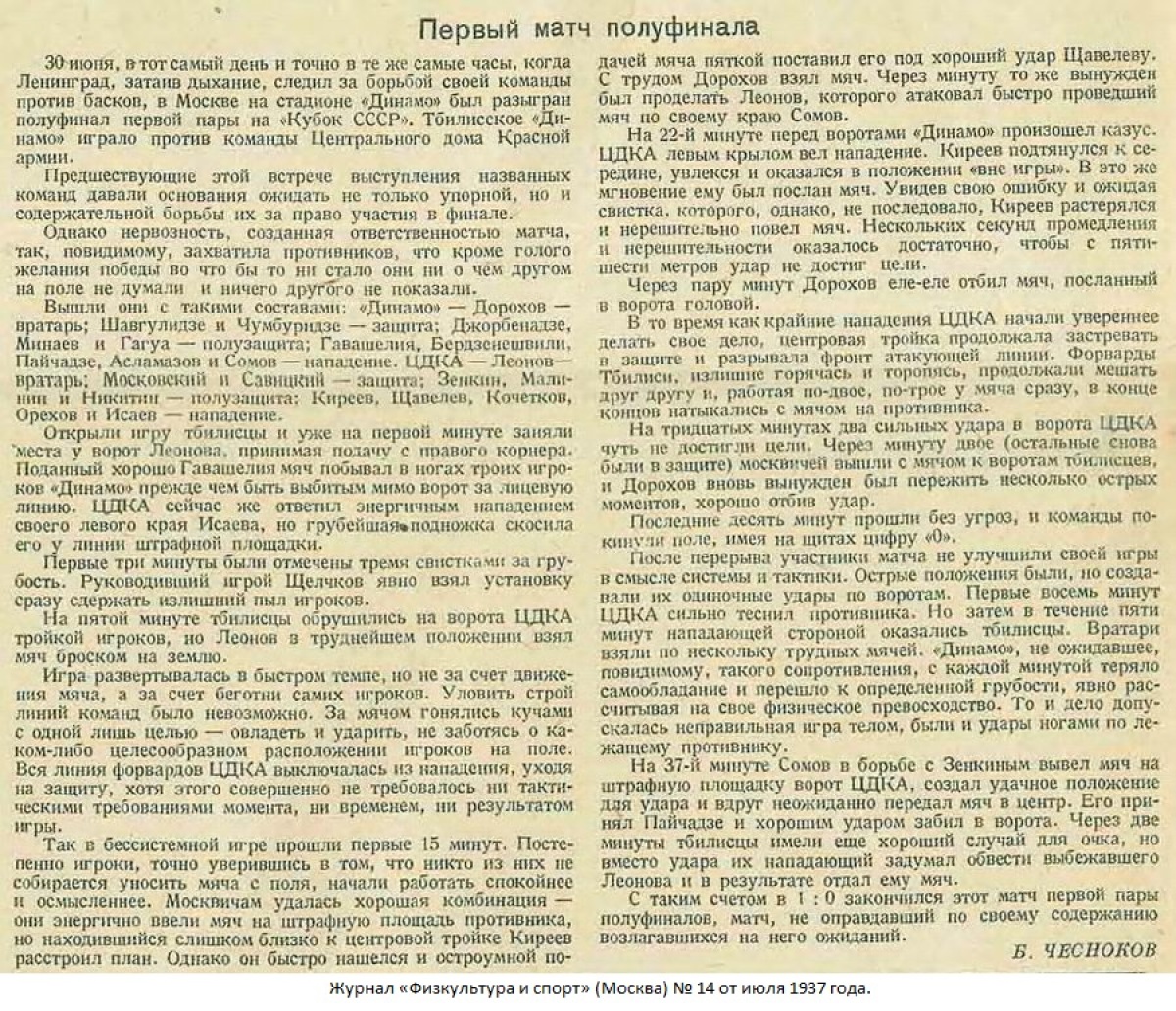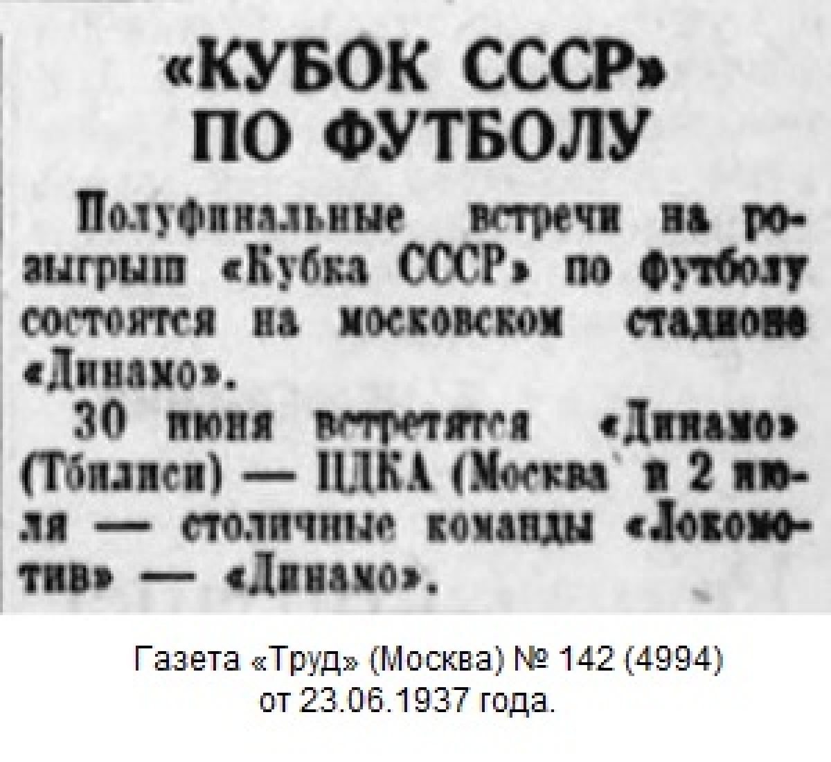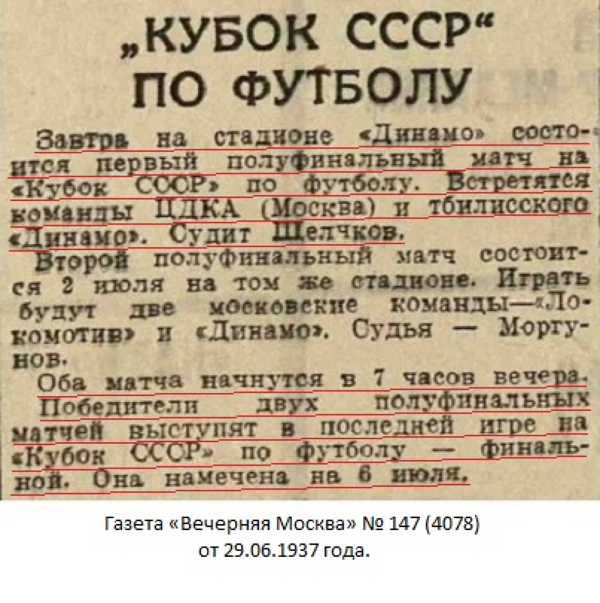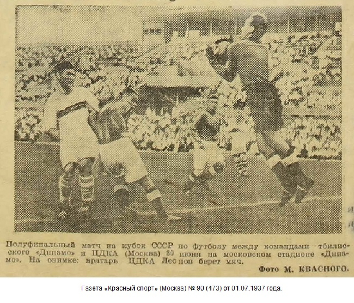 Комментарий. Начиная с 1/4 финала, все матчи Кубка СССР 1937 года проходили в Москве. Согласно жеребьевке хозяином поля в этом матче была команда «Динамо» (Тбилиси).