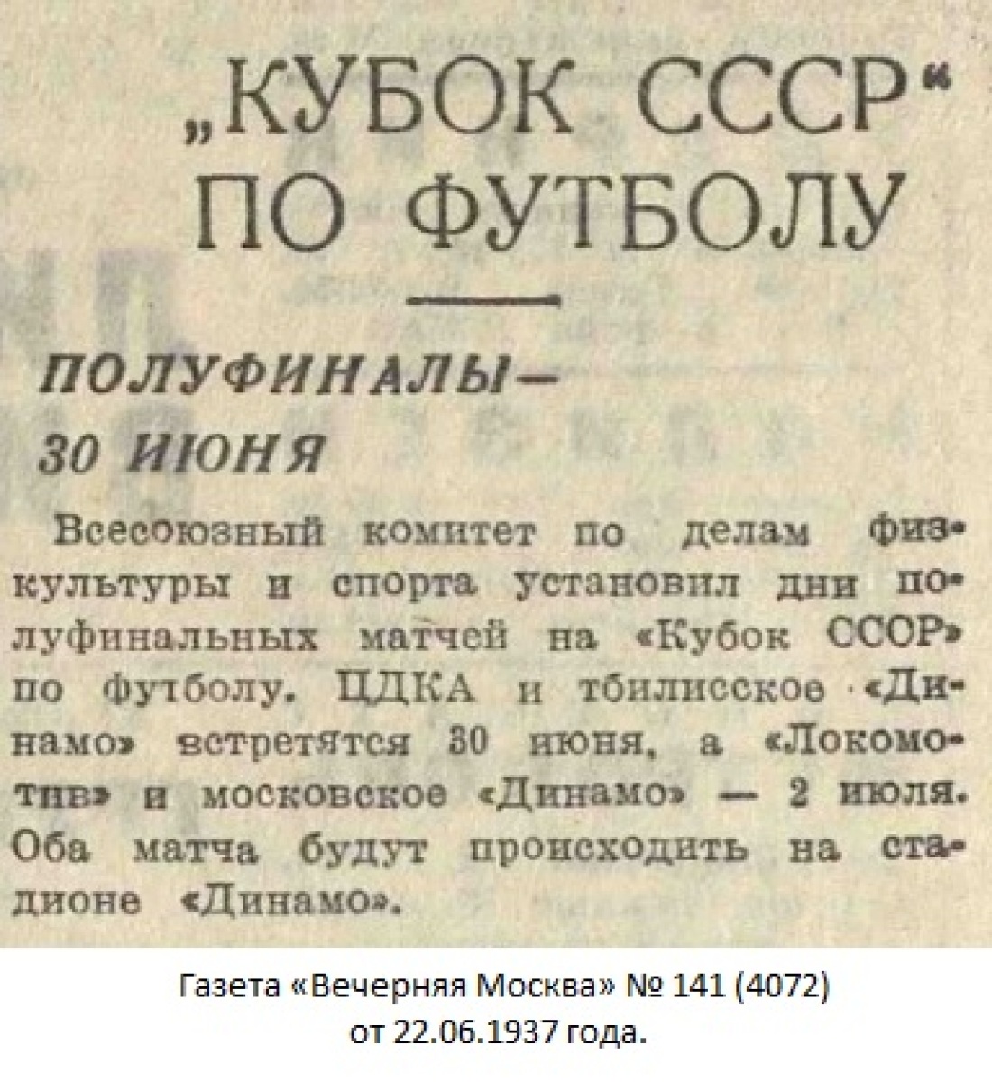 МОСКВА. 30 июня. (От нашего спец. корр.). Сегодня на стадионе «Динамо» состоялась полуфинальная встреча футбольных команд мастеров тбилисского «Динамо» и московского ЦДКА. Среди многотысячных зрителей на стадионе присутствуют тт. Берия, Косарев, Харченко. Судит матч т. Щелчков.