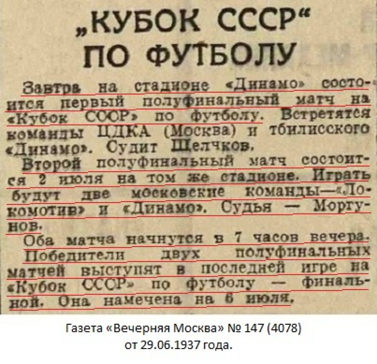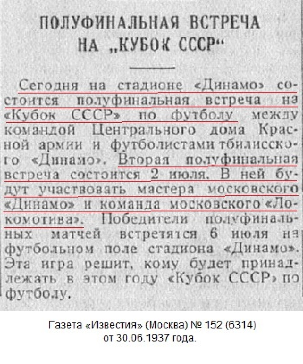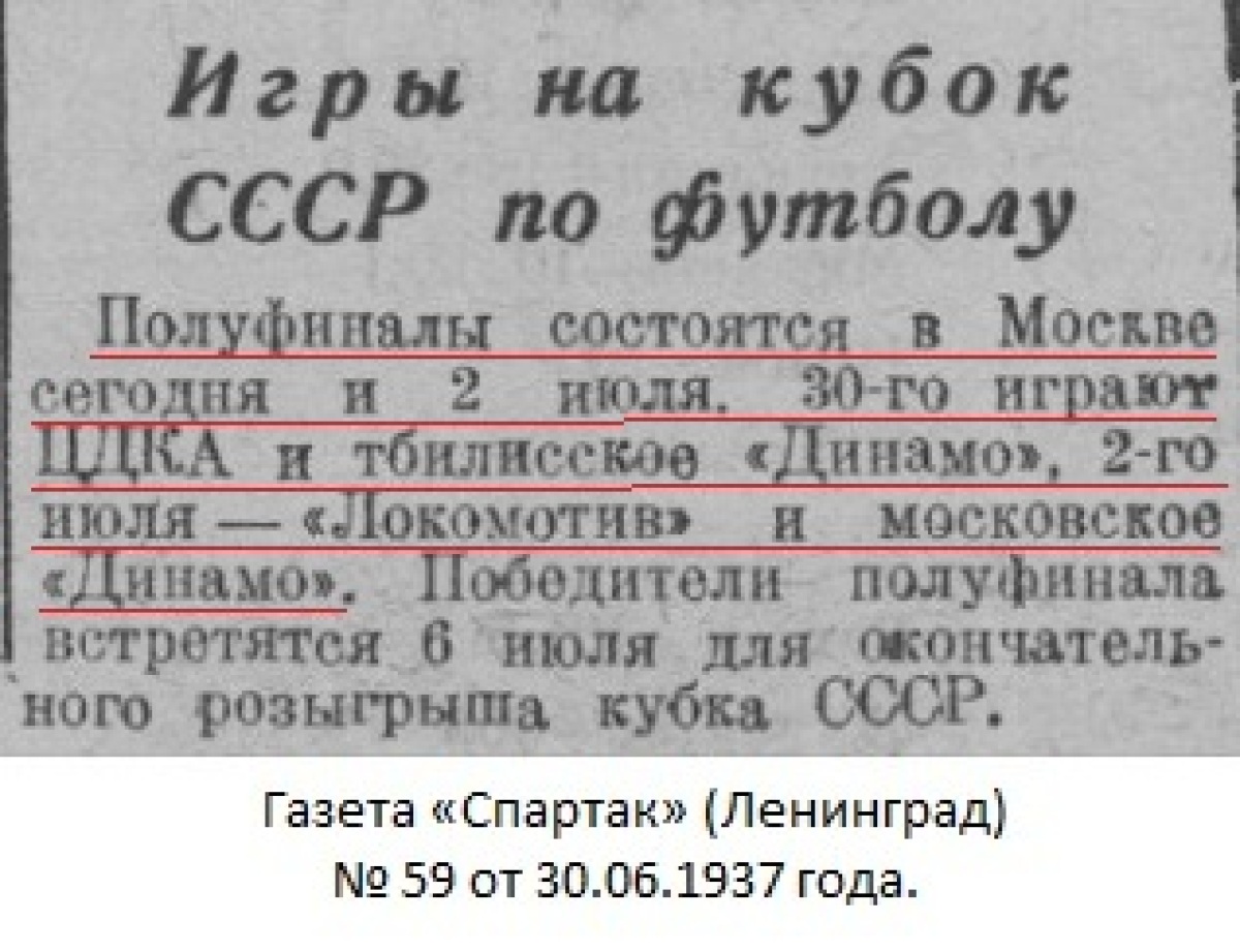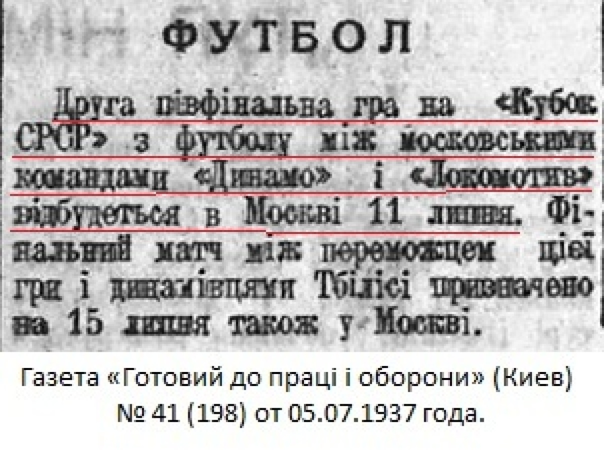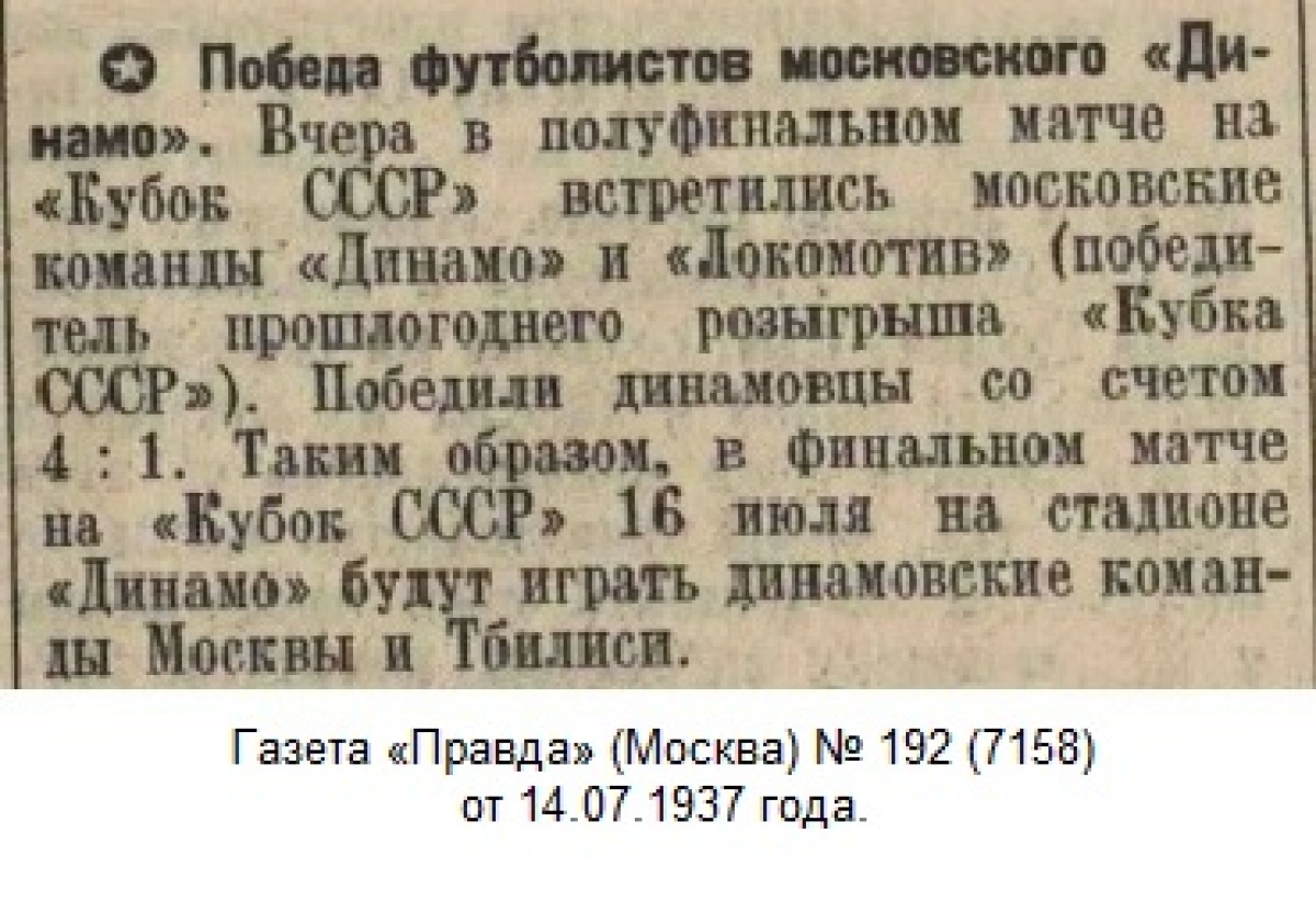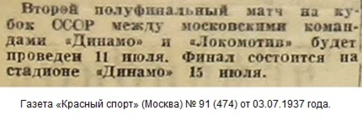 Комментарий. Начиная с 1/4 финала, все матчи Кубка СССР 1937 года проходили в Москве. Согласно жеребьевке хозяином поля в этом матче была команда «Динамо» (Москва).