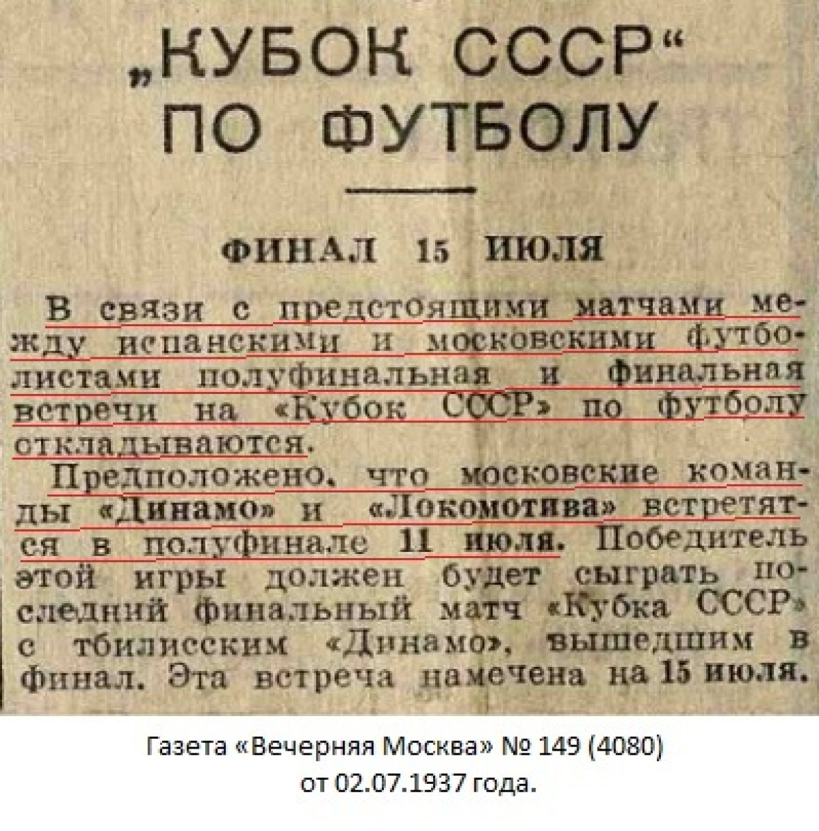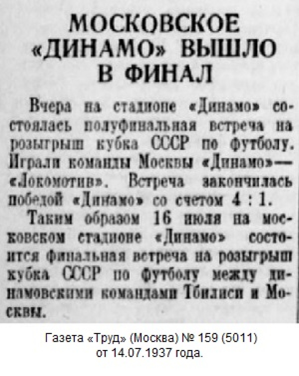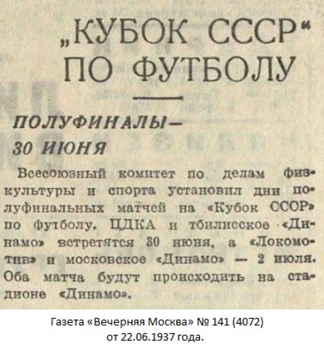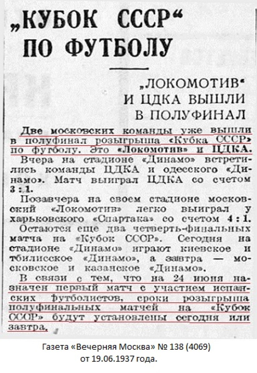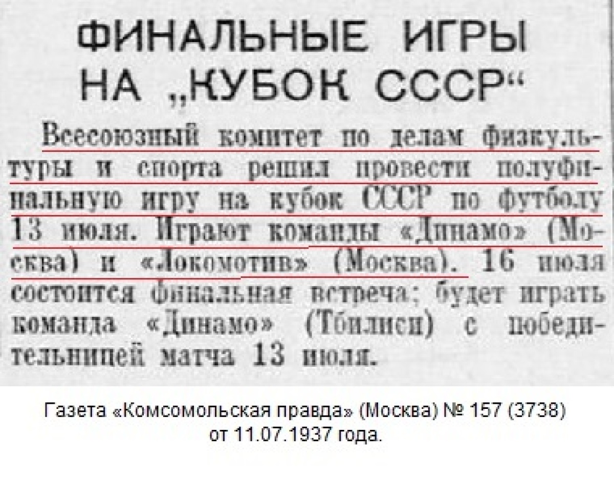 Комментарий. Начиная с 1/4 финала, все матчи Кубка СССР 1937 года проходили в Москве. Согласно жеребьевке хозяином поля в этом матче была команда «Динамо» (Москва).