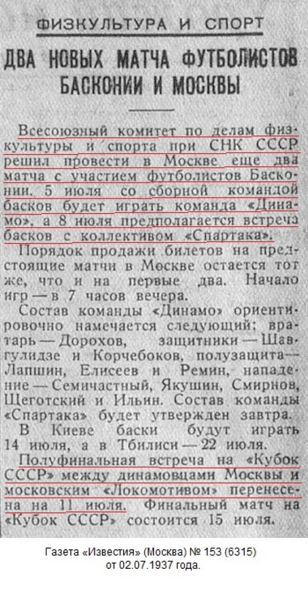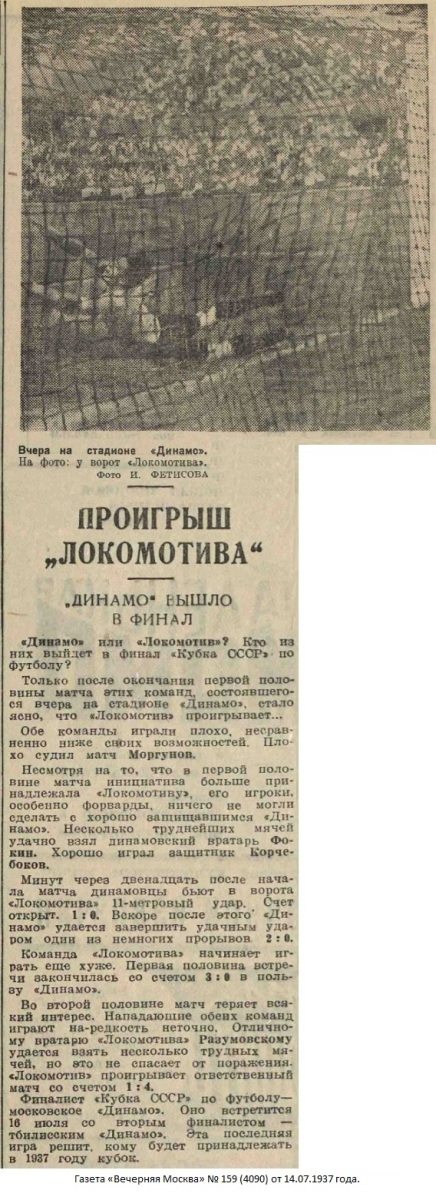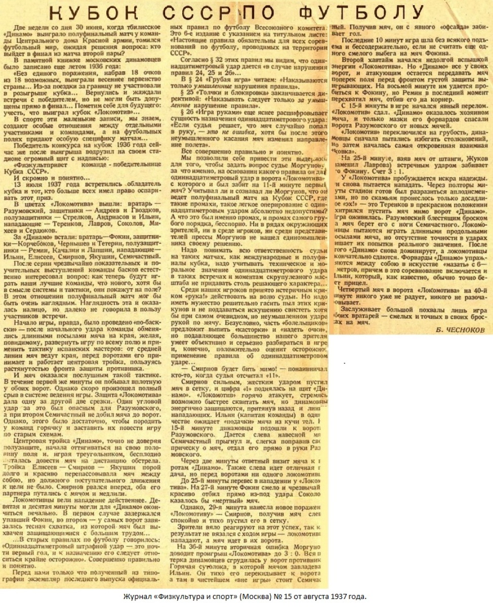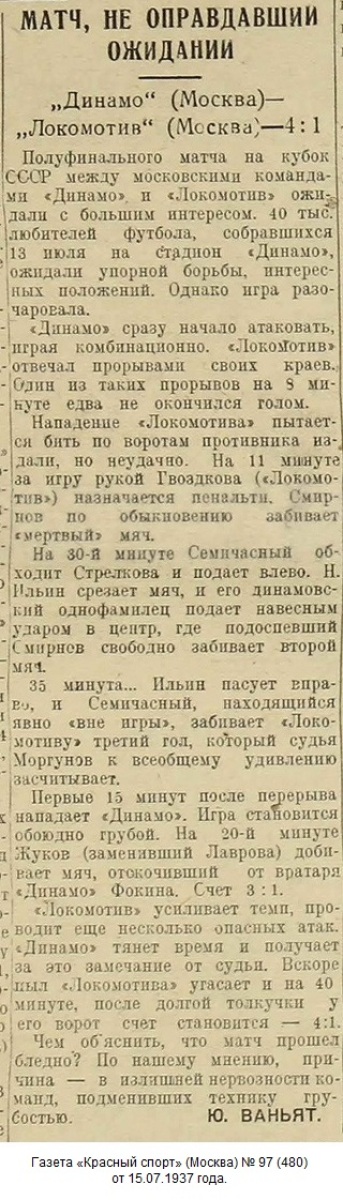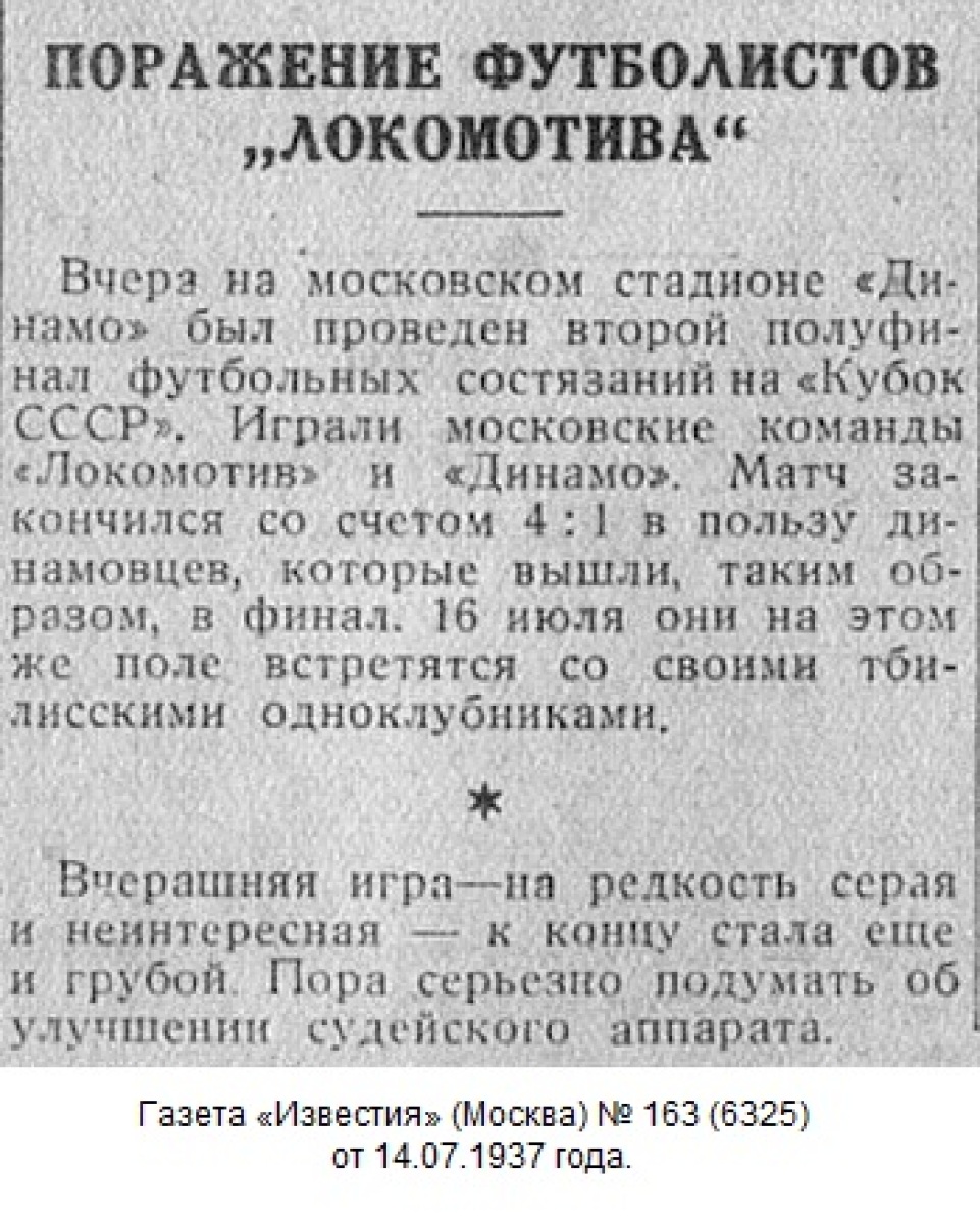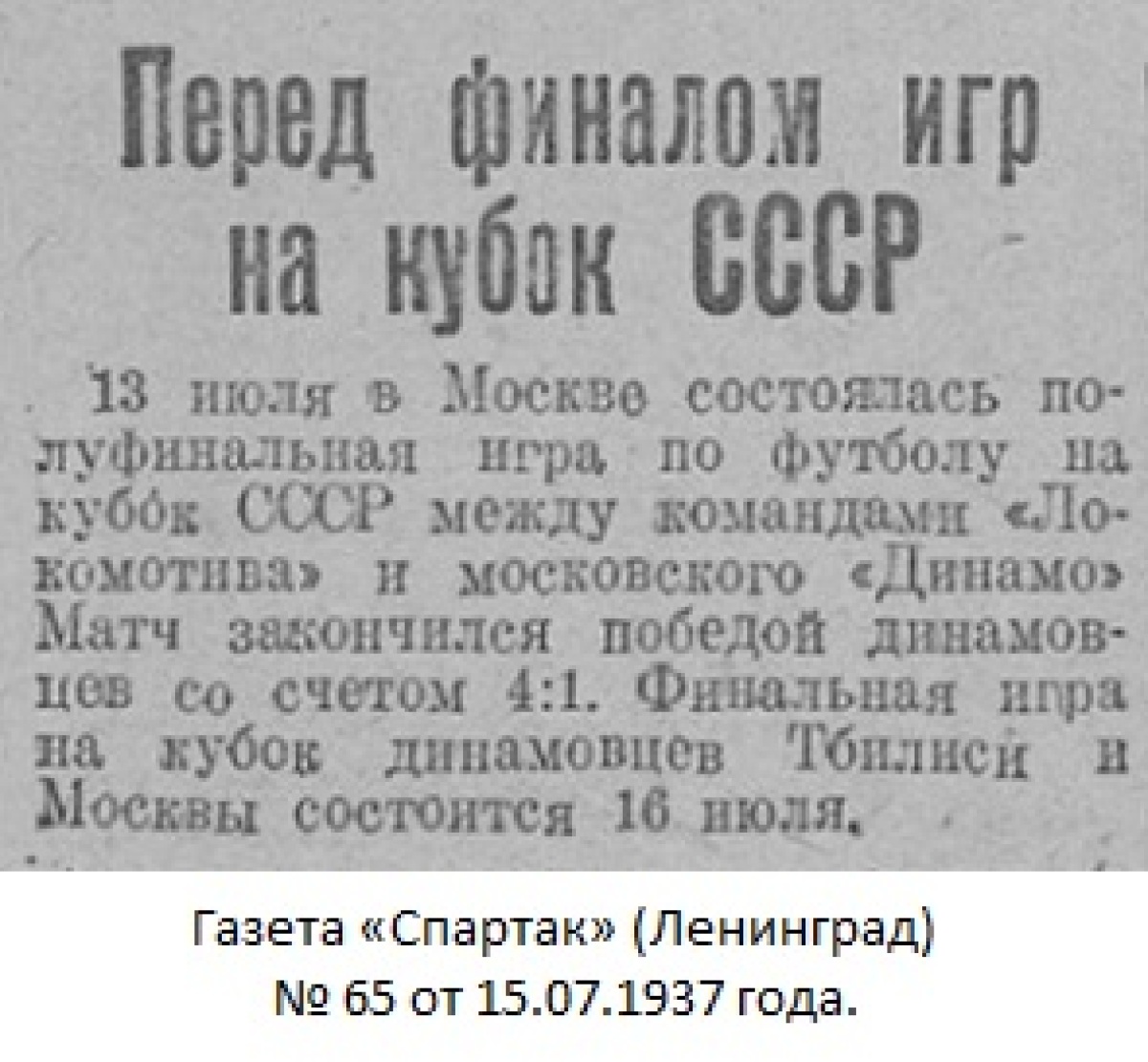 Комментарий. Начиная с 1/4 финала, все матчи Кубка СССР 1937 года проходили в Москве. Согласно жеребьевке хозяином поля в этом матче была команда «Динамо» (Москва).