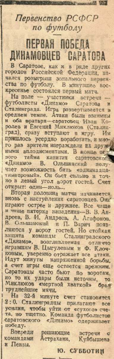 «Динамо» Саратов - «Динамо» Сталинград - 2:0