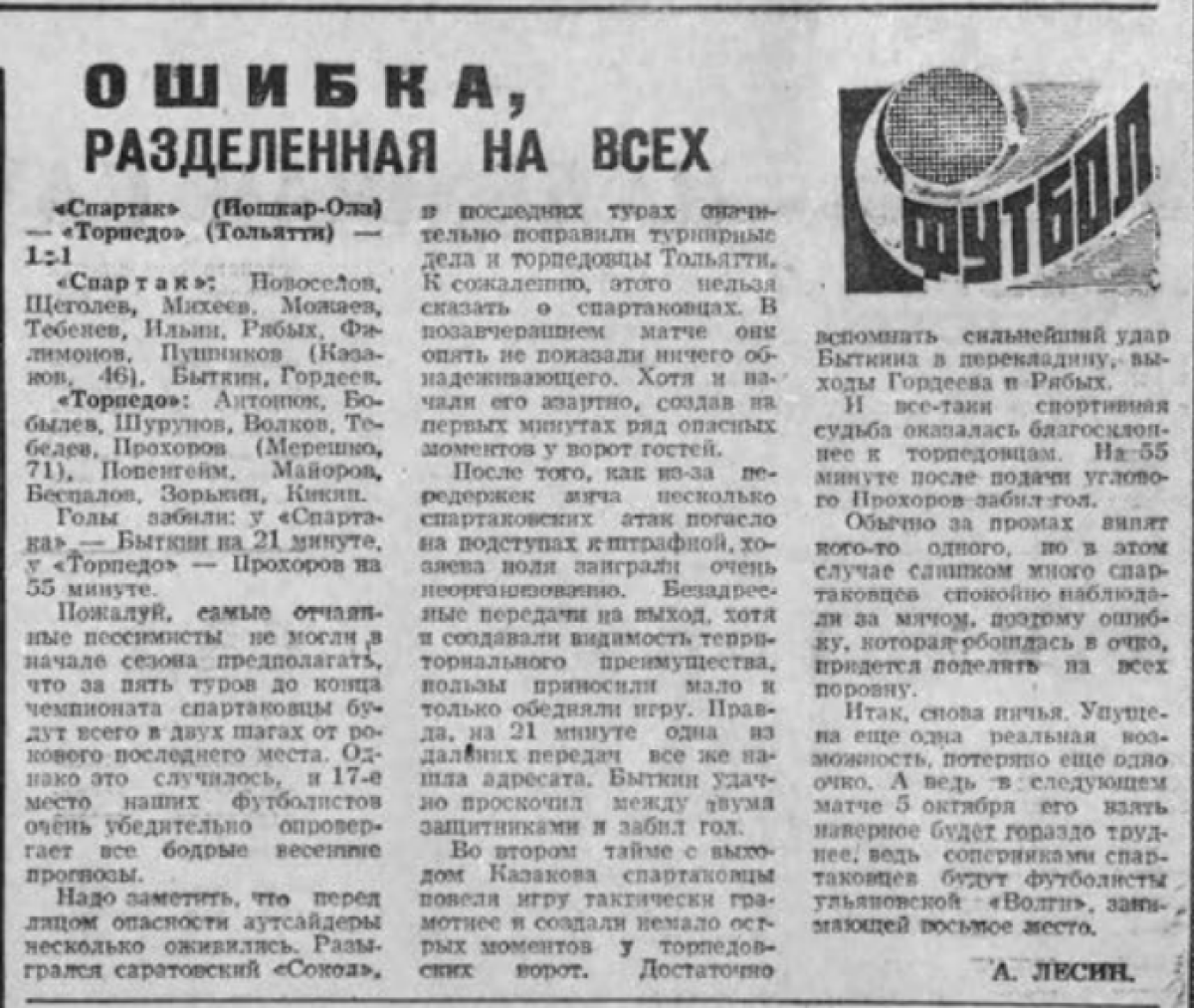 «Спартак» Йошкар-Ола - «Торпедо» Тольятти - 1:1