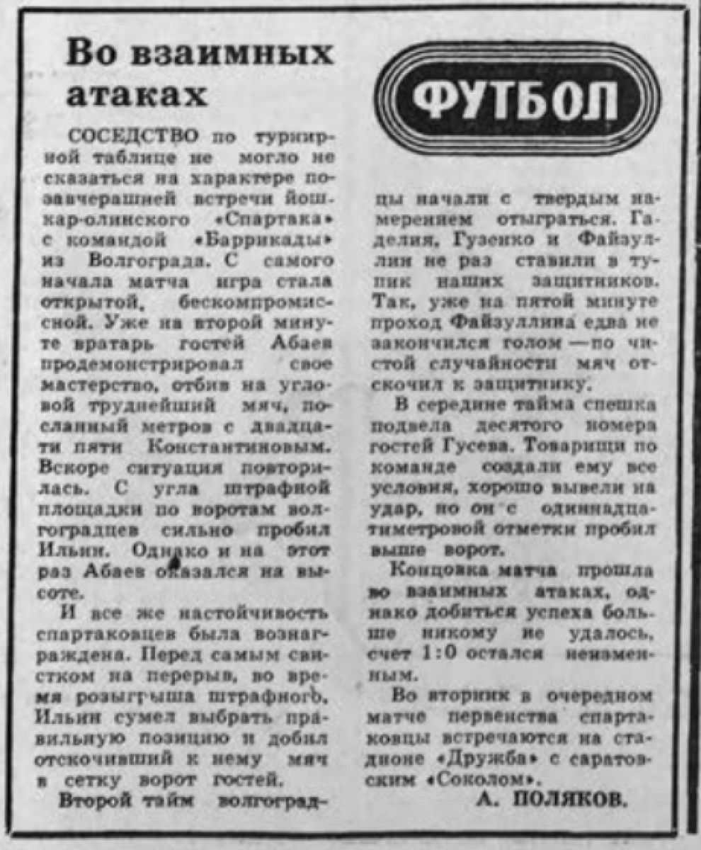 «Спартак» Йошкар-Ола - «Баррикады» Волгоград - 1:0