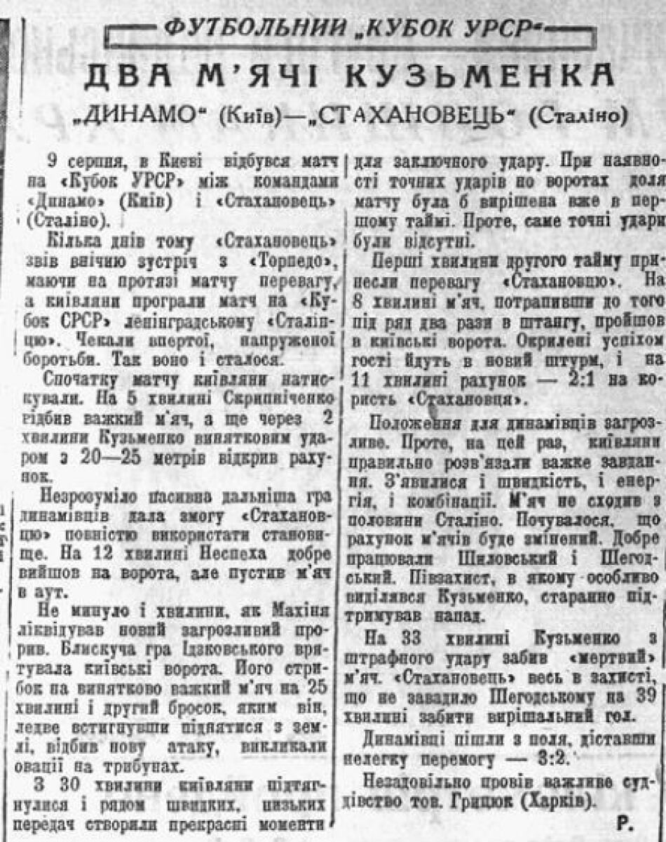 Дата игры 9 августа, ниже заметка из Украинского спорта, выпуск за 11 августа 1938.