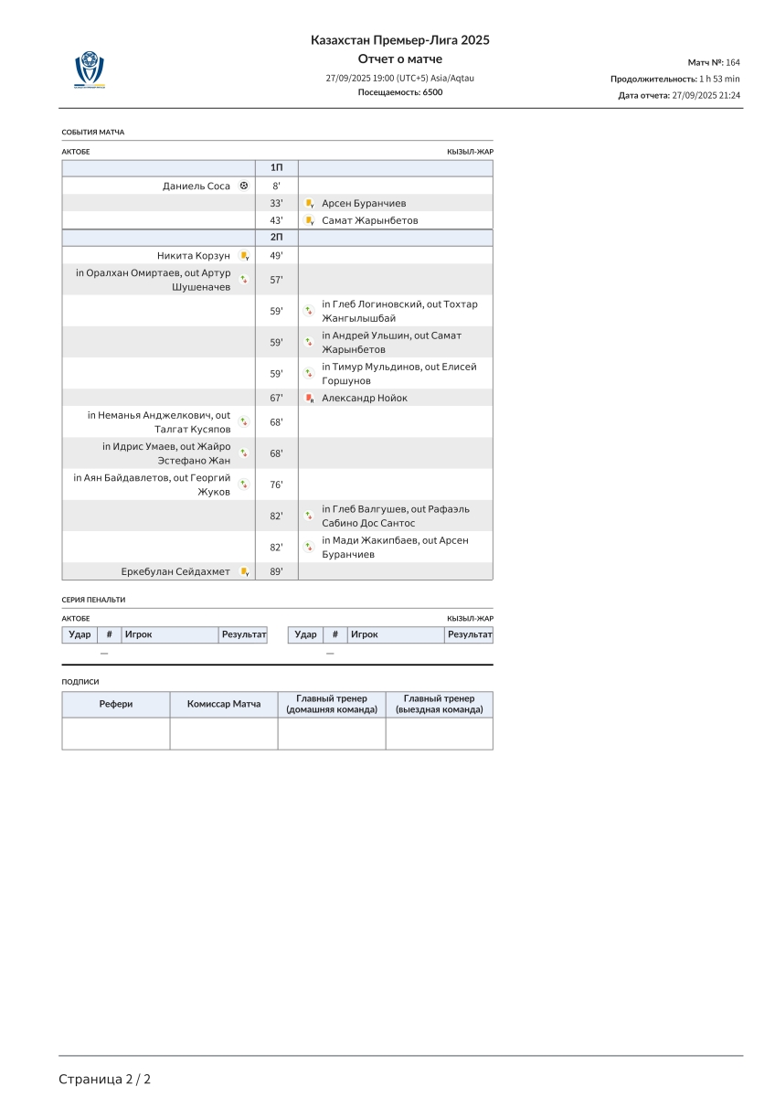 «Актобе» Актобе - «Кызыл-Жар СК» Петропавловск - 1:0
