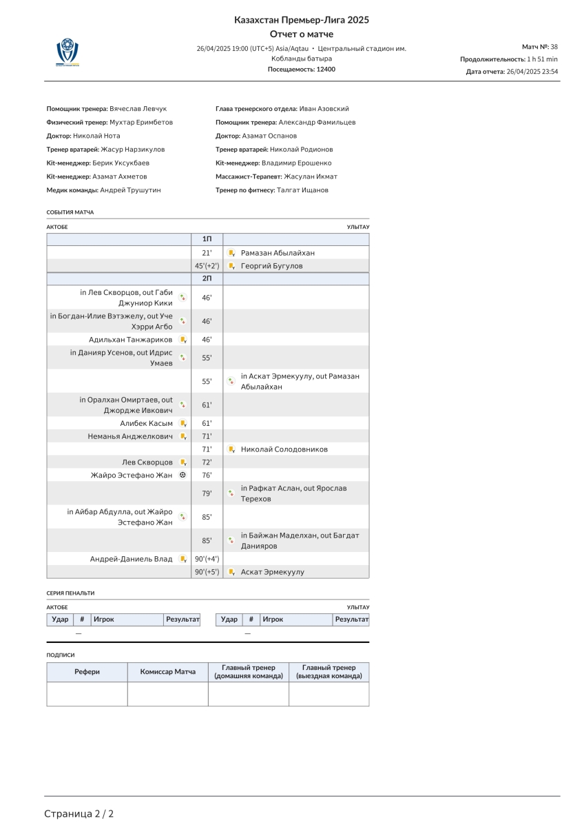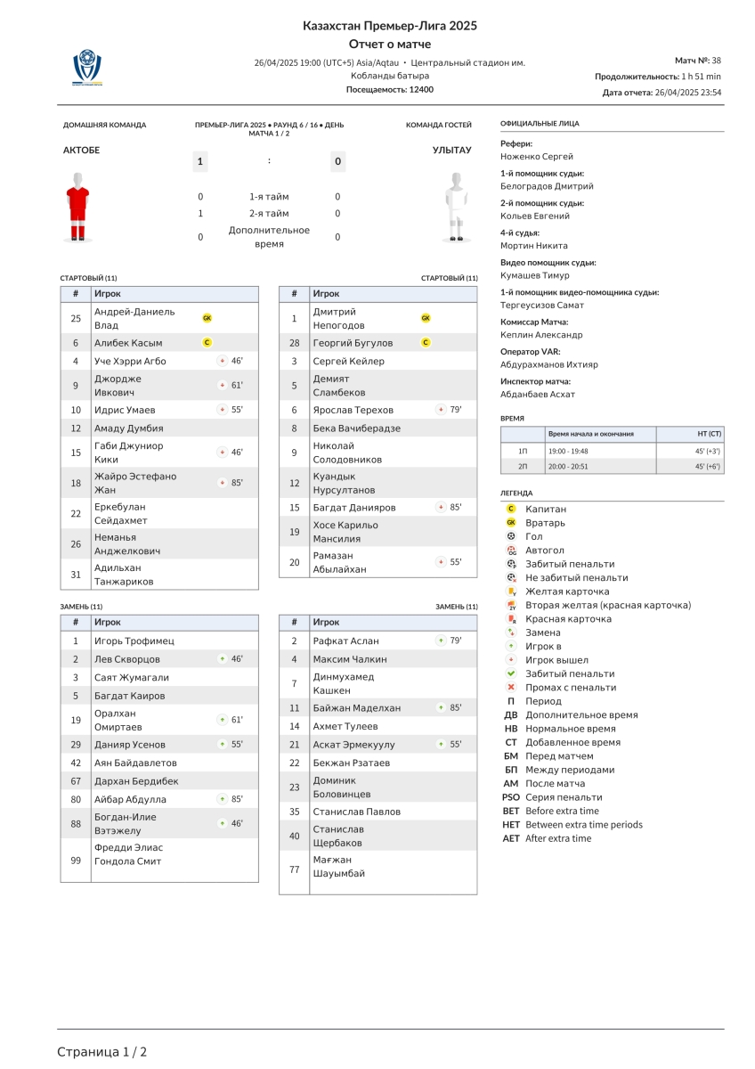 «Актобе» Актобе - «Улытау» Джезказган - 1:0