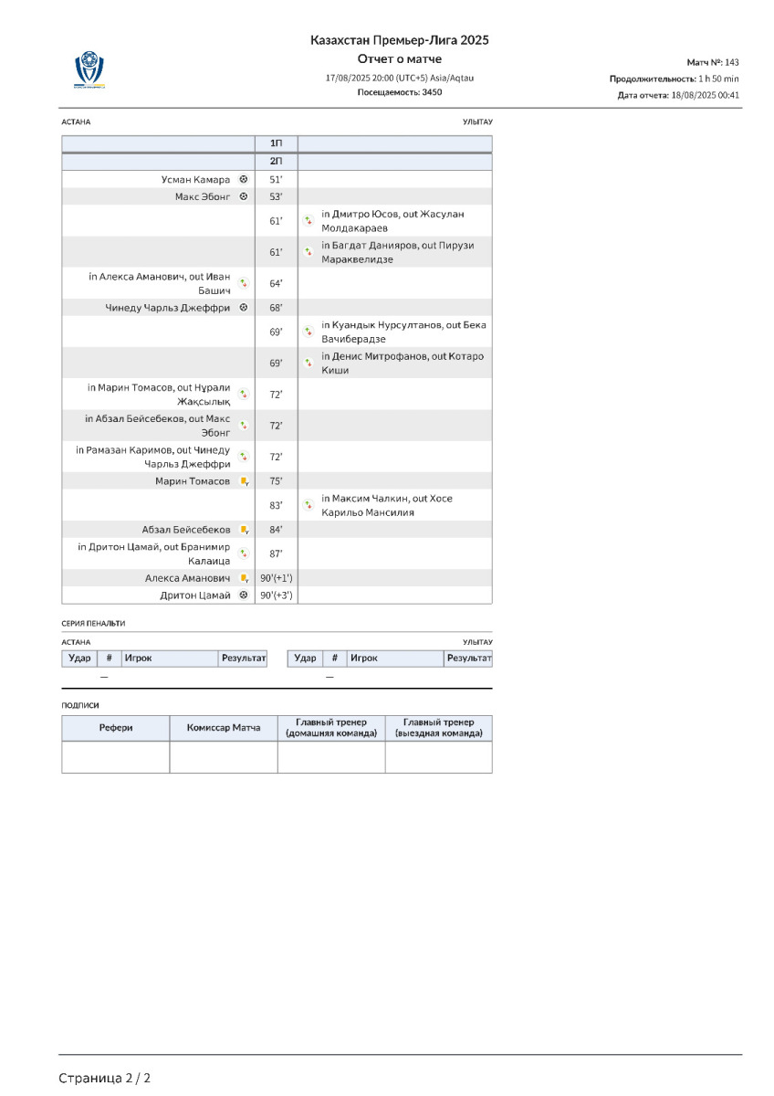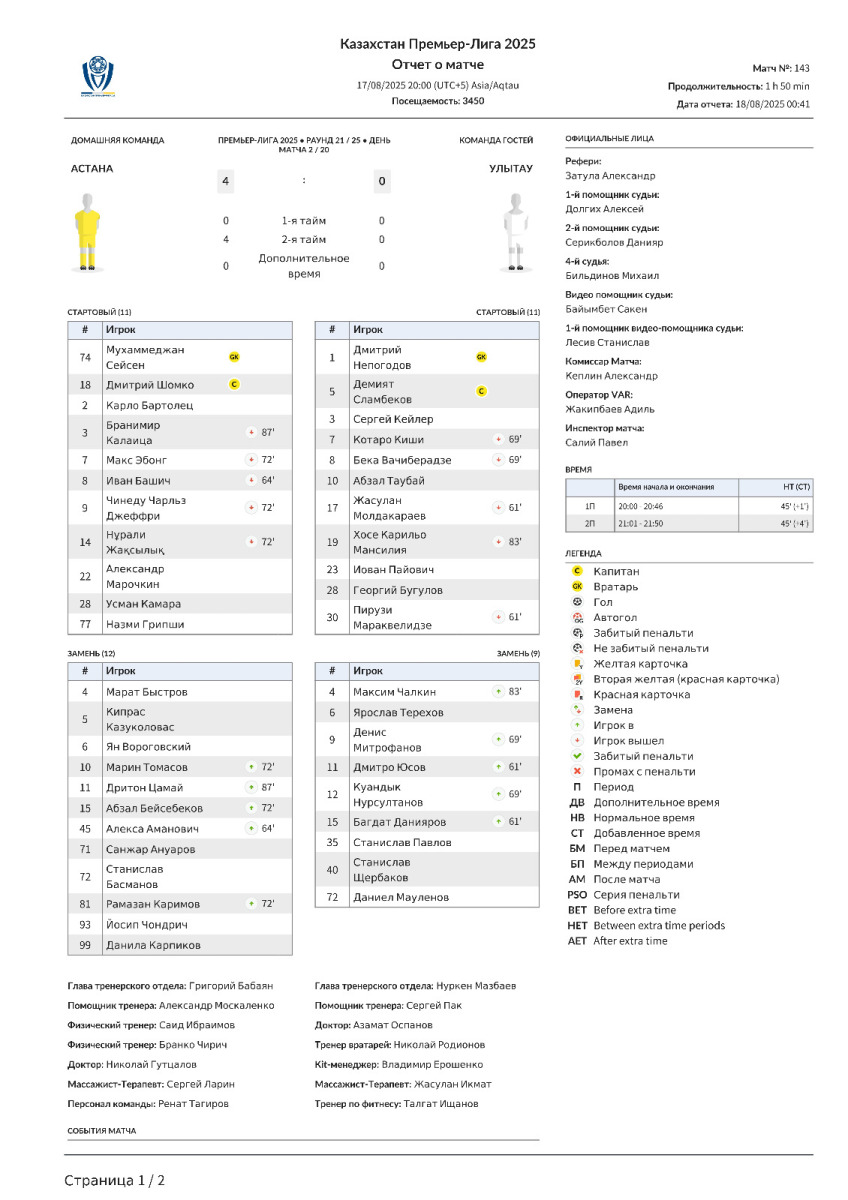 «Астана» Астана - «Улытау» Джезказган - 4:0