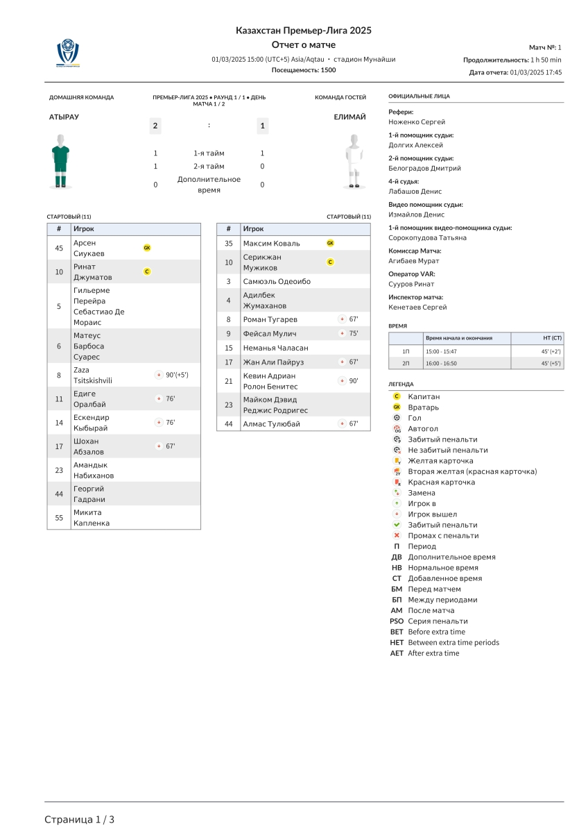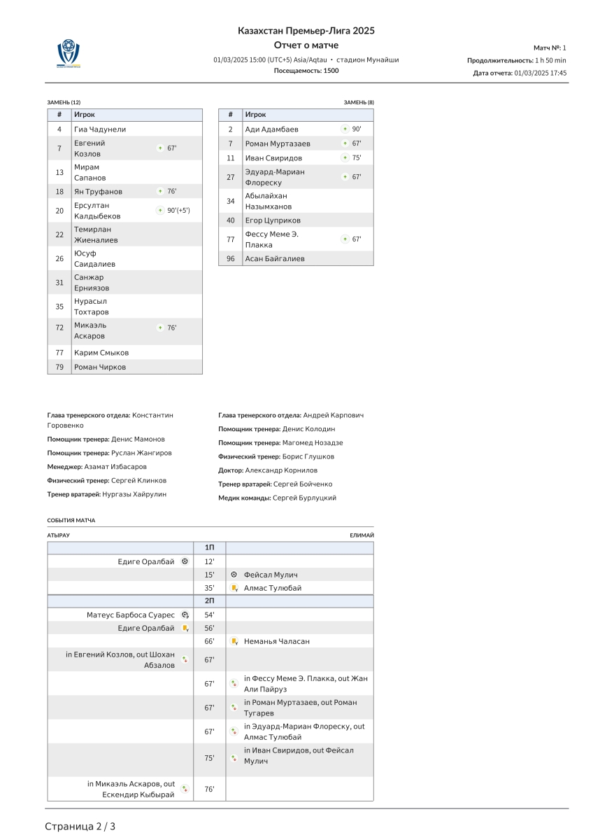 «Атырау» Атырау - «Елимай» Семей - 2:1