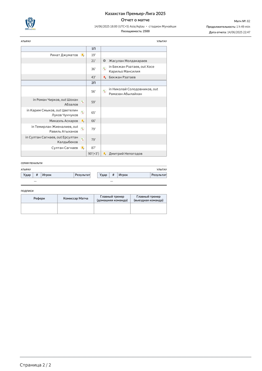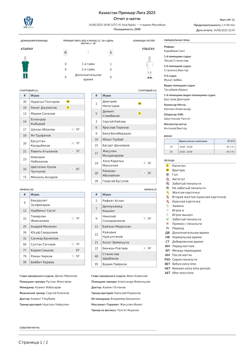 «Атырау» Атырау - «Улытау» Джезказган - 0:1