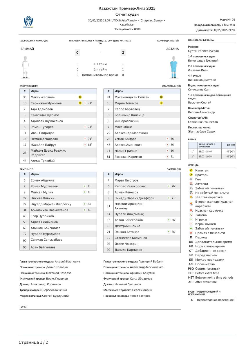 «Елимай» Семей - «Астана» Астана - 0:2