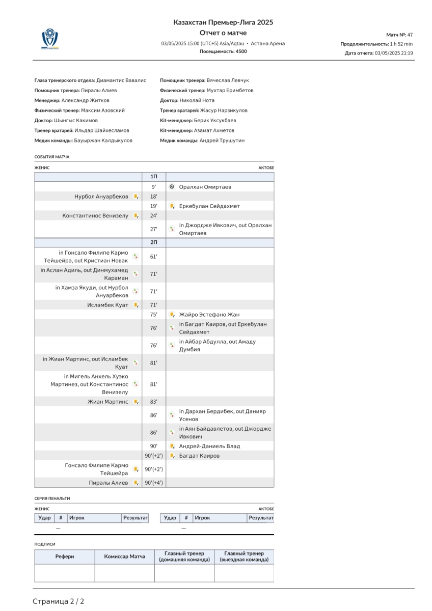 «Женис» Астана - «Актобе» Актобе - 0:1