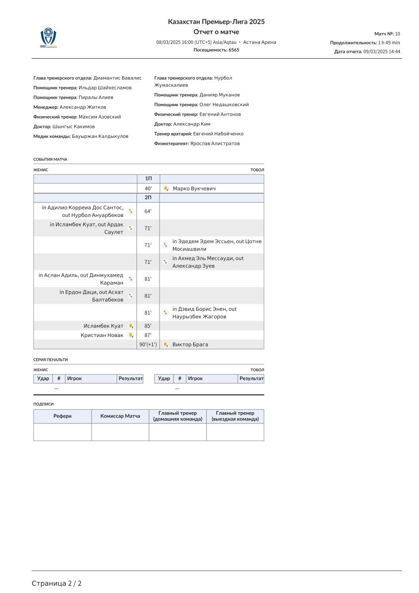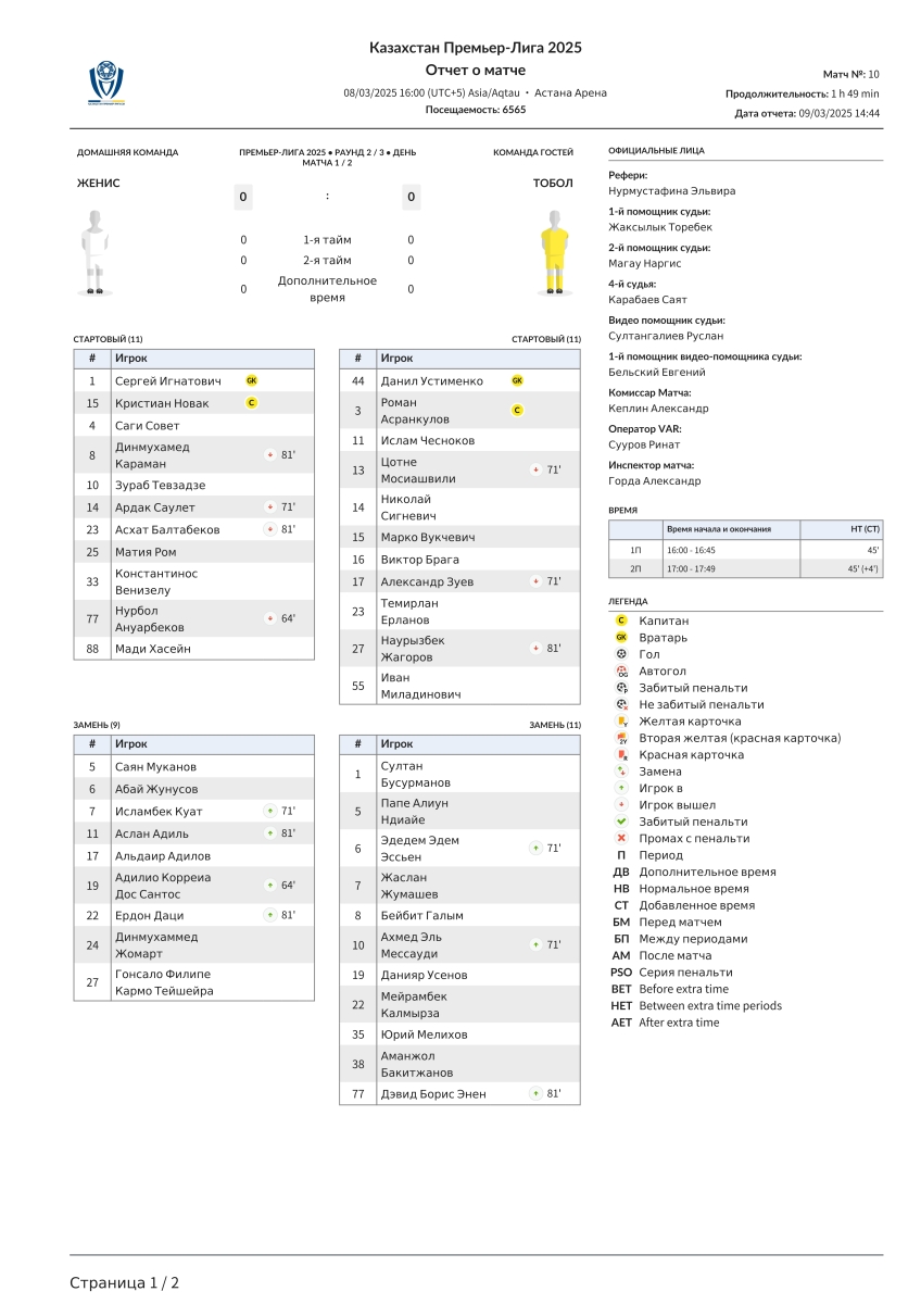 «Женис» Астана - «Тобол» Кустанай - 0:0
