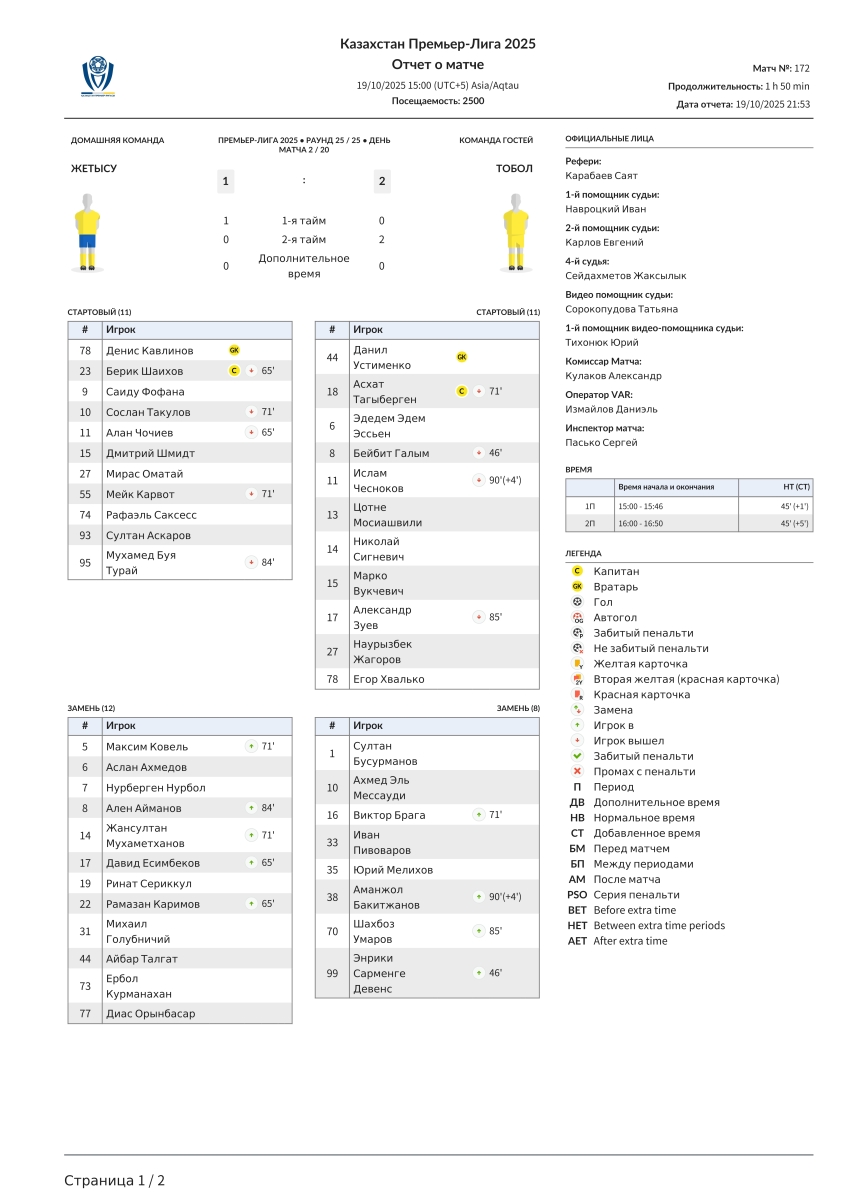 «Жетысу» Талды-Курган - «Тобол» Кустанай - 1:2
