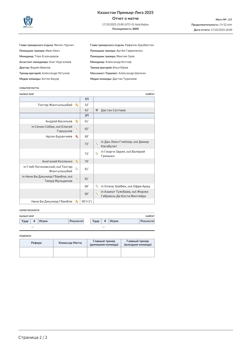 «Кызыл-Жар СК» Петропавловск - «Кайрат» Алма-Ата - 0:1