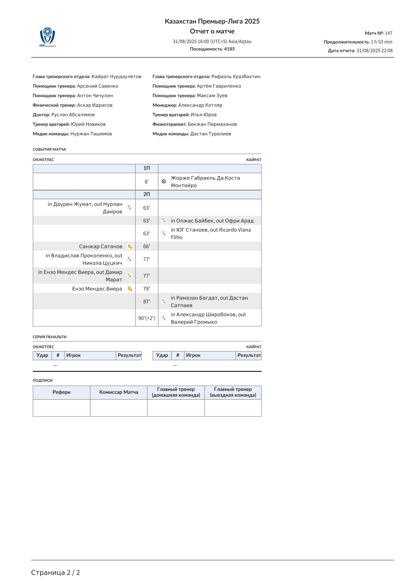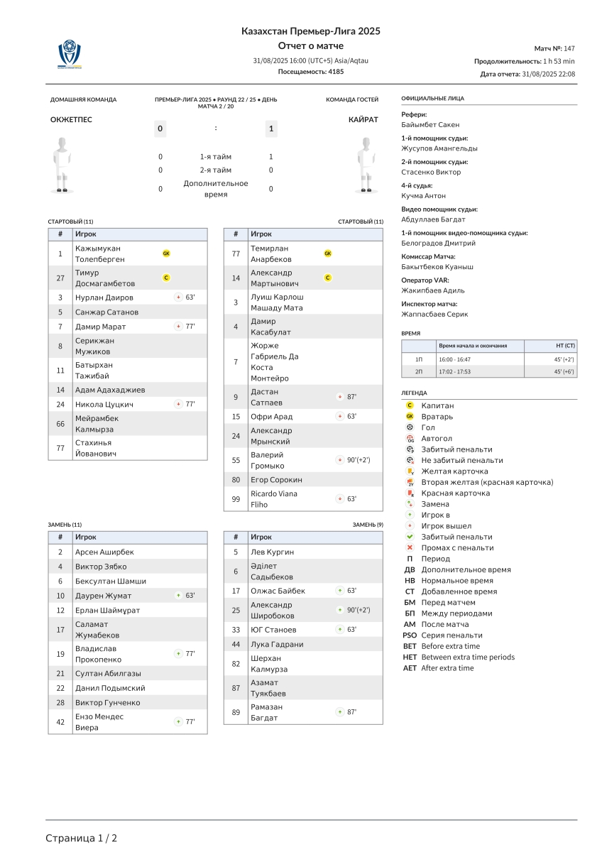 «Окжетпес» Кокчетав - «Кайрат» Алма-Ата - 0:1