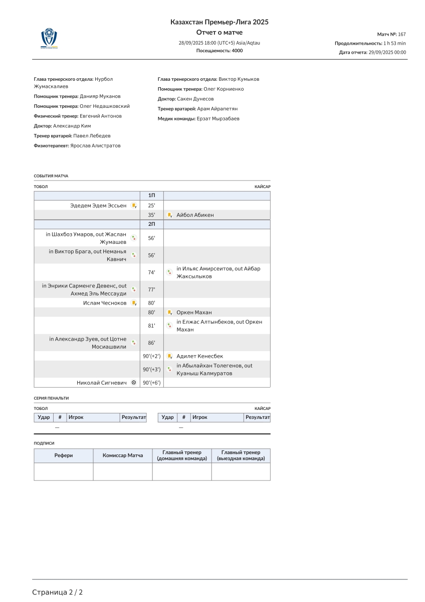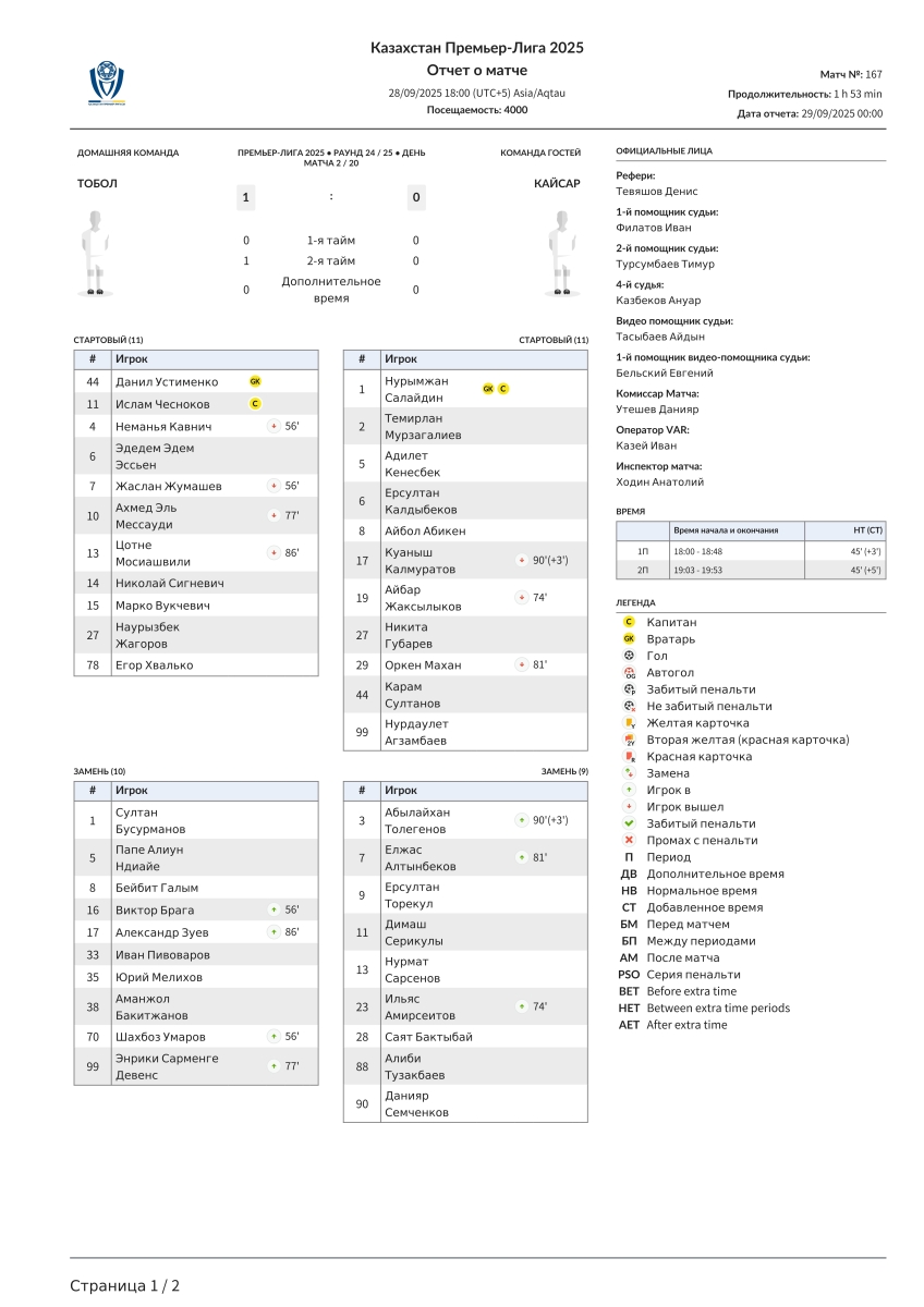 «Тобол» Кустанай - «Кайсар» Кзыл-Орда - 1:0