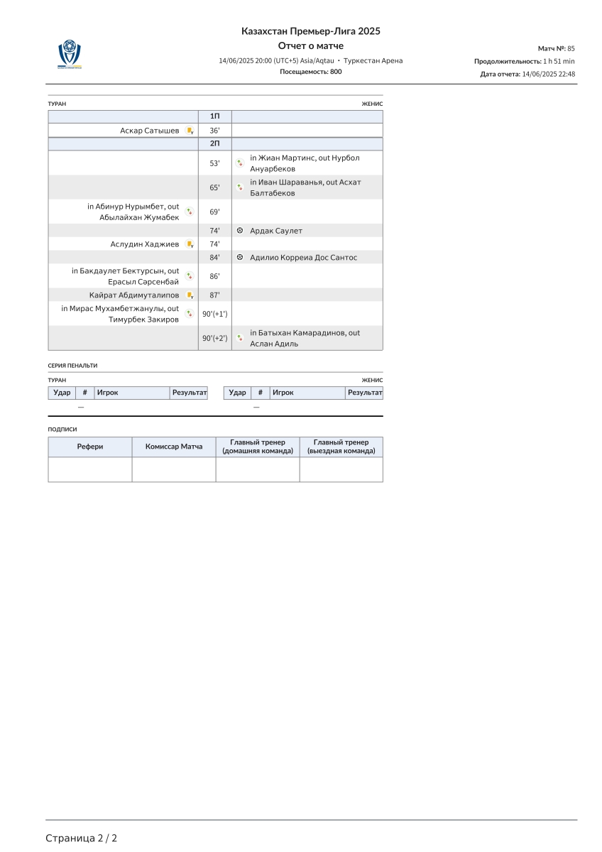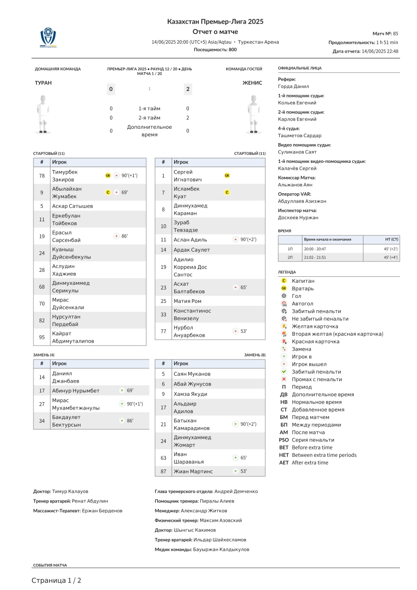 «Туран» Туркестан - «Женис» Астана - 0:2