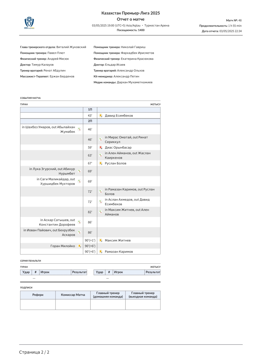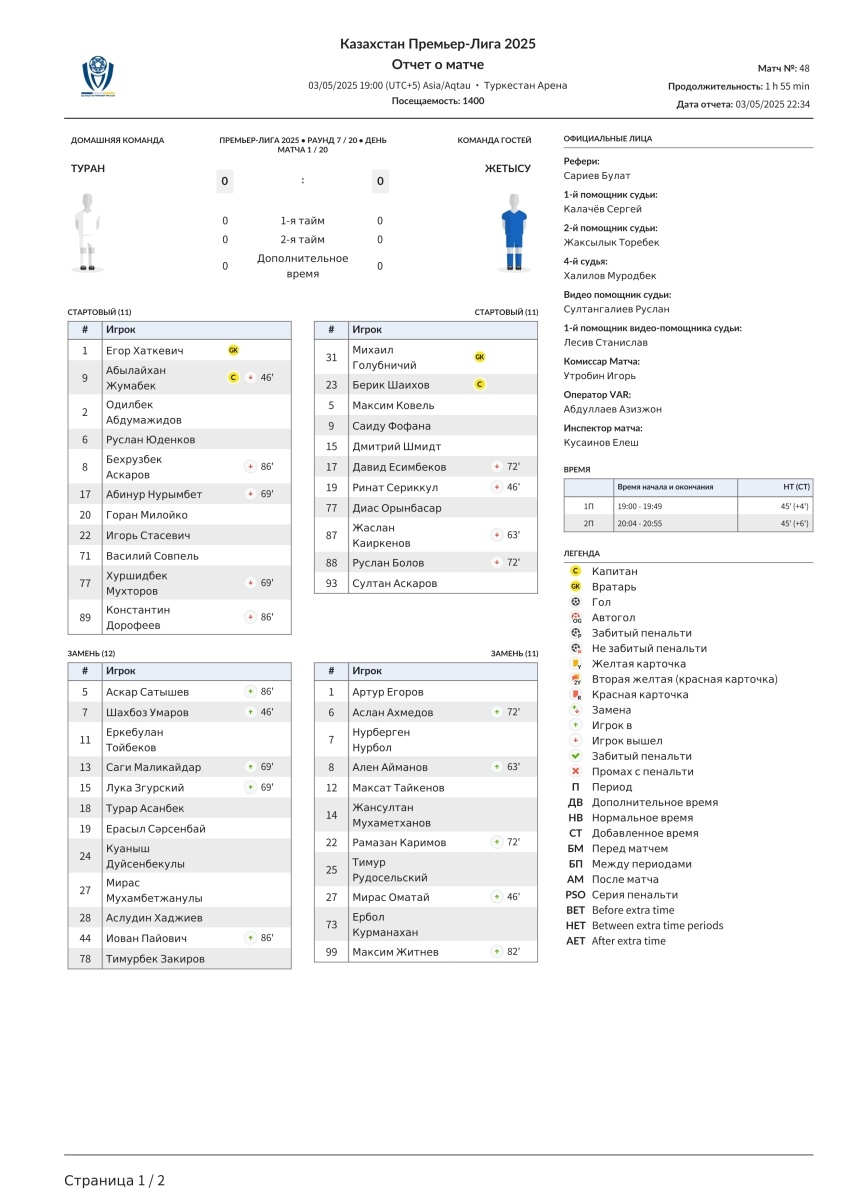 «Туран» Туркестан - «Жетысу» Талды-Курган - 0:0