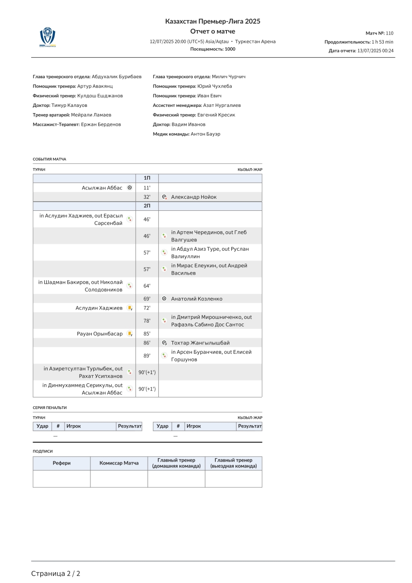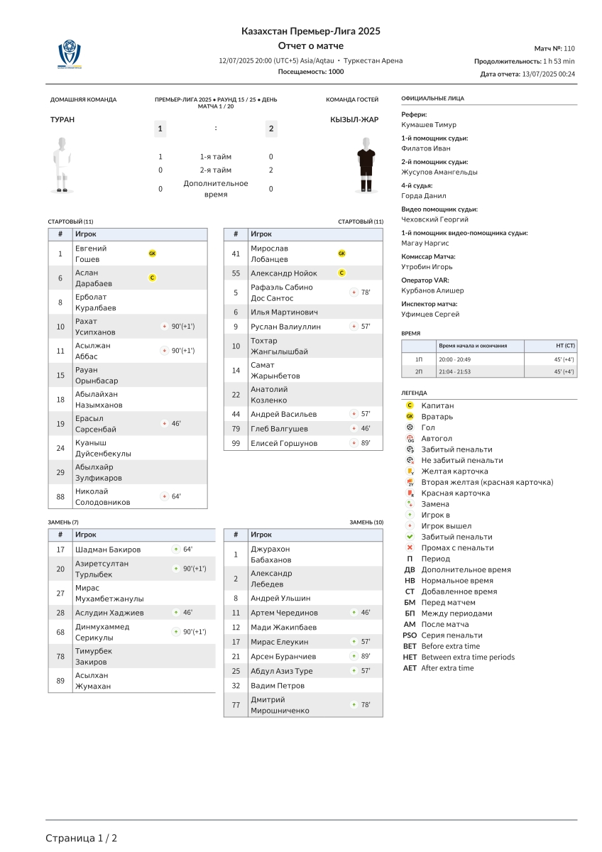 «Туран» Туркестан - «Кызыл-Жар СК» Петропавловск - 1:2