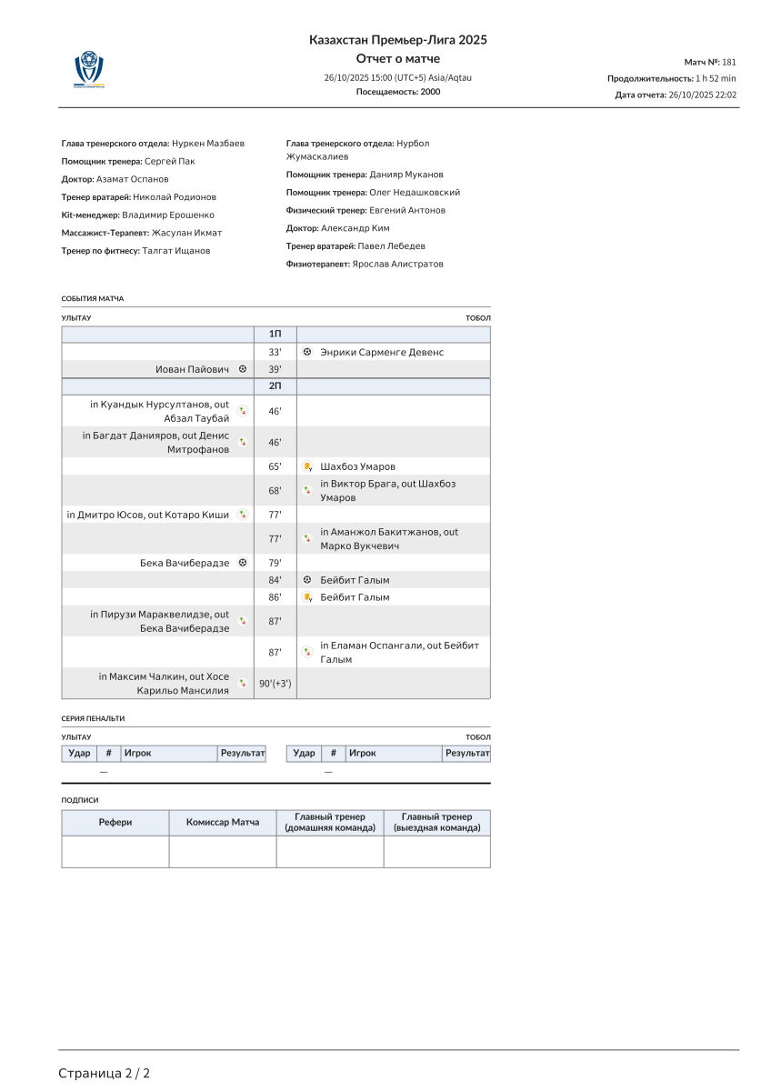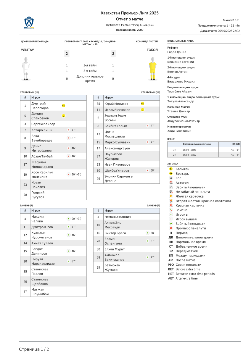 «Улытау» Джезказган - «Тобол» Кустанай - 2:2