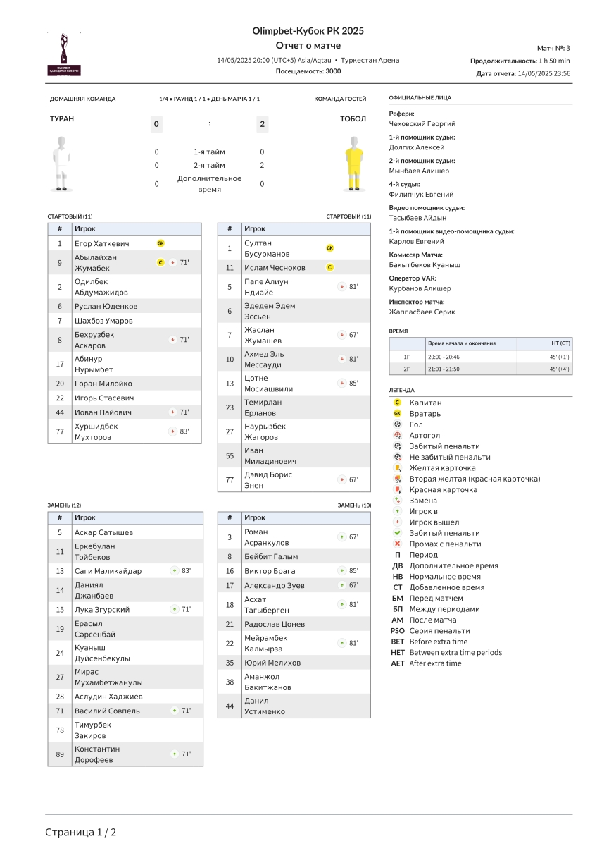 «Туран» Туркестан - «Тобол» Кустанай - 0:2