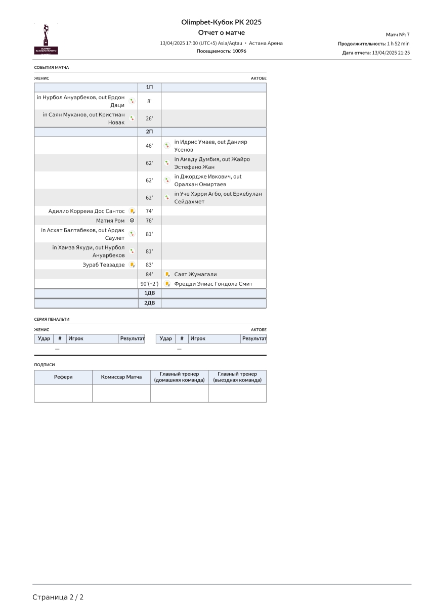 «Женис» Астана - «Актобе» Актобе - 1:0