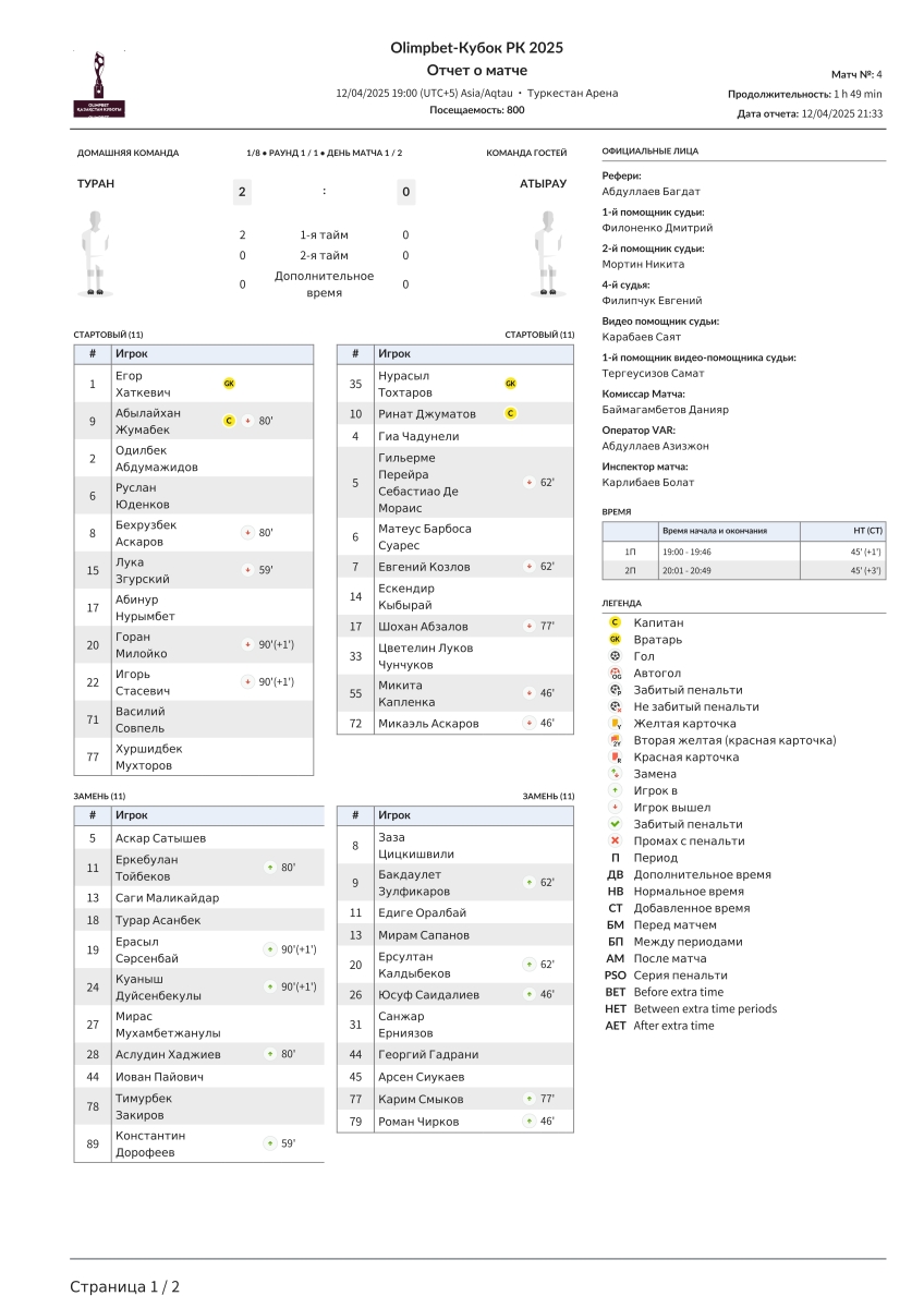 «Туран» Туркестан - «Атырау» Атырау - 2:0