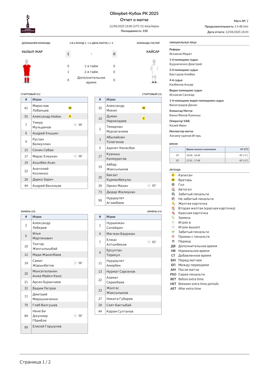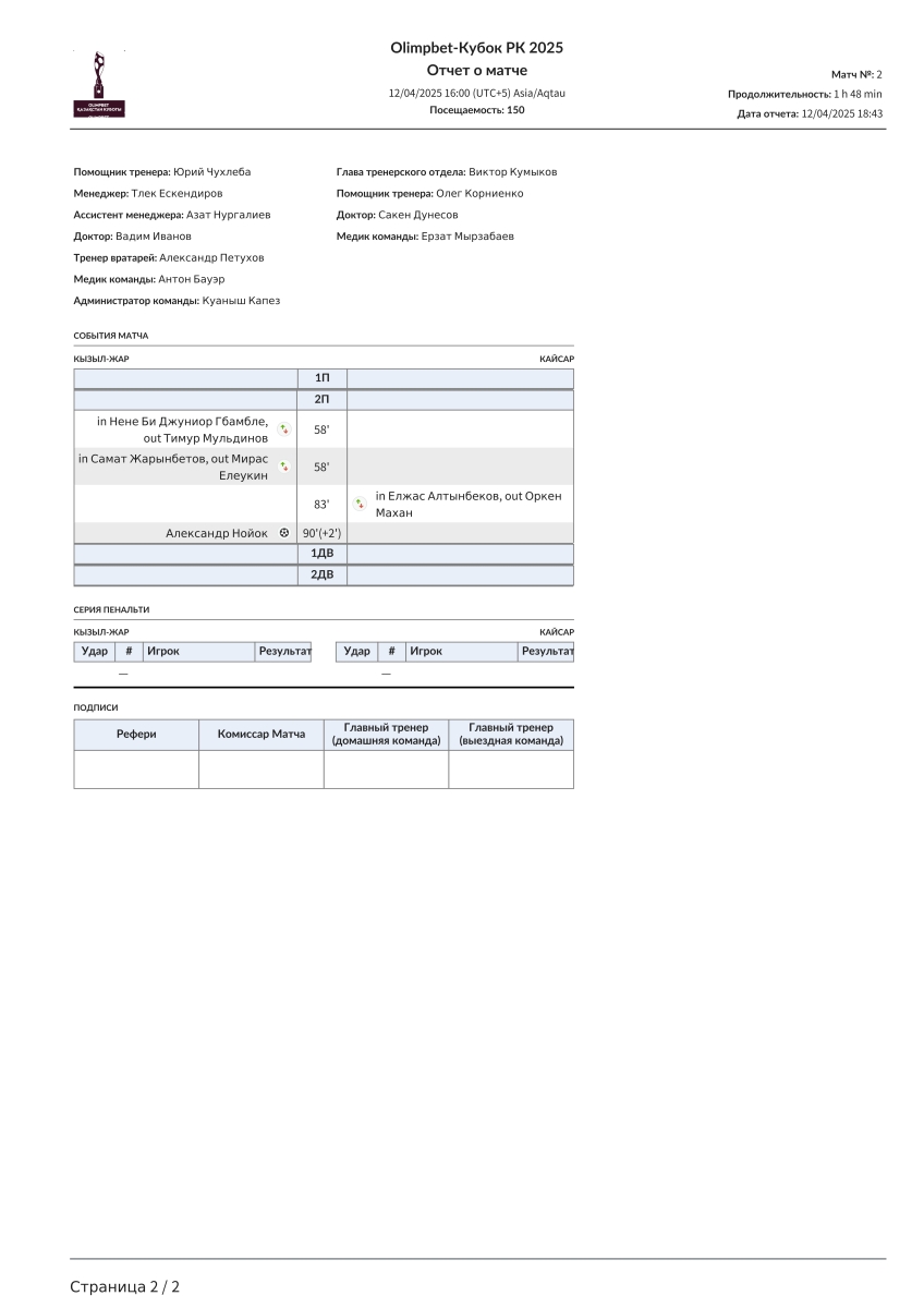 «Кызыл-Жар СК» Петропавловск - «Кайсар» Кзыл-Орда - 1:0