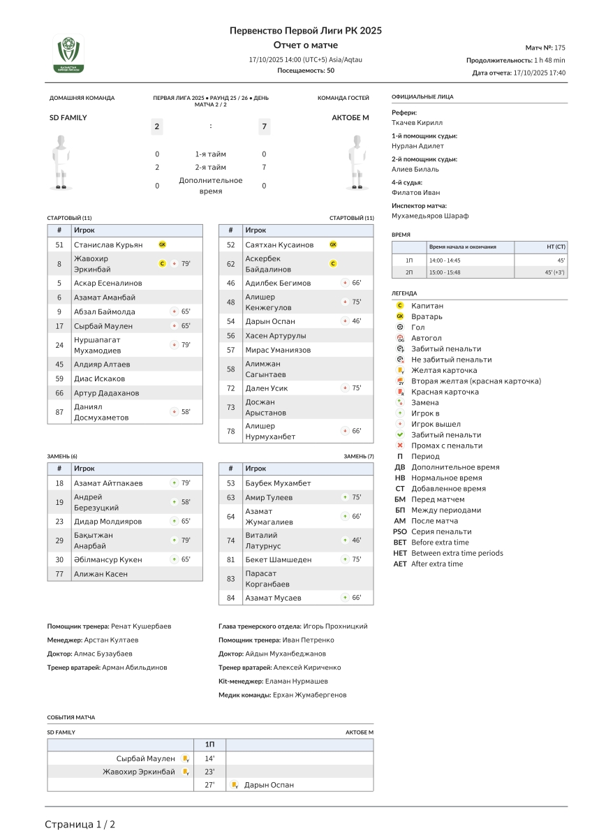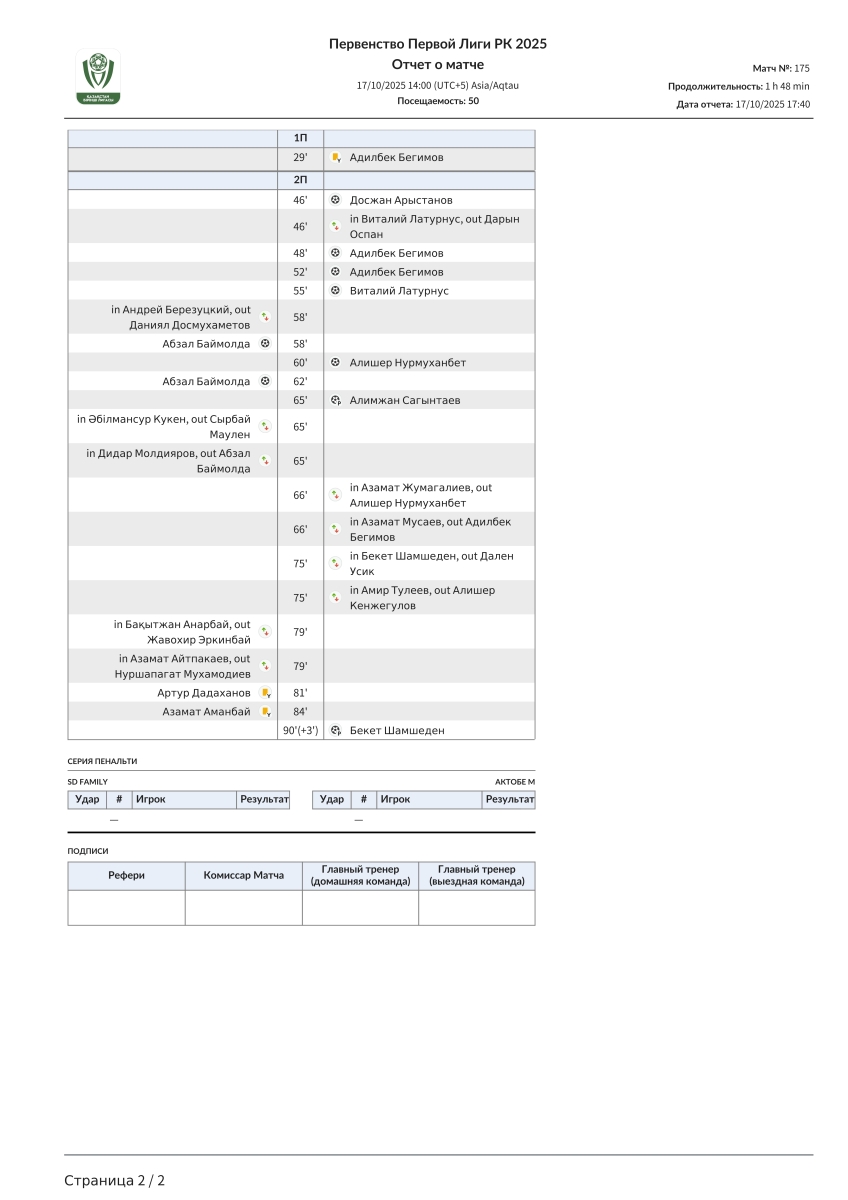«SD Family» Астана - «Актобе U-21» Актобе - 2:7