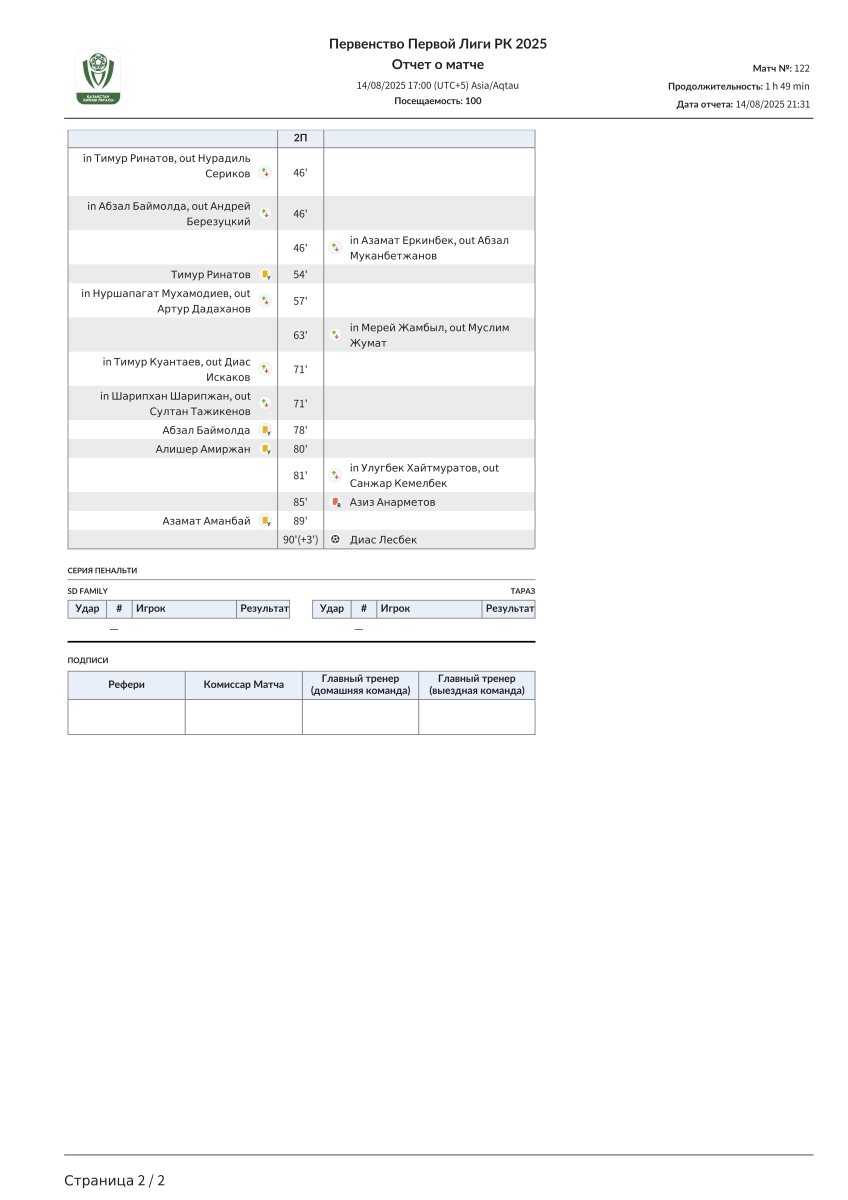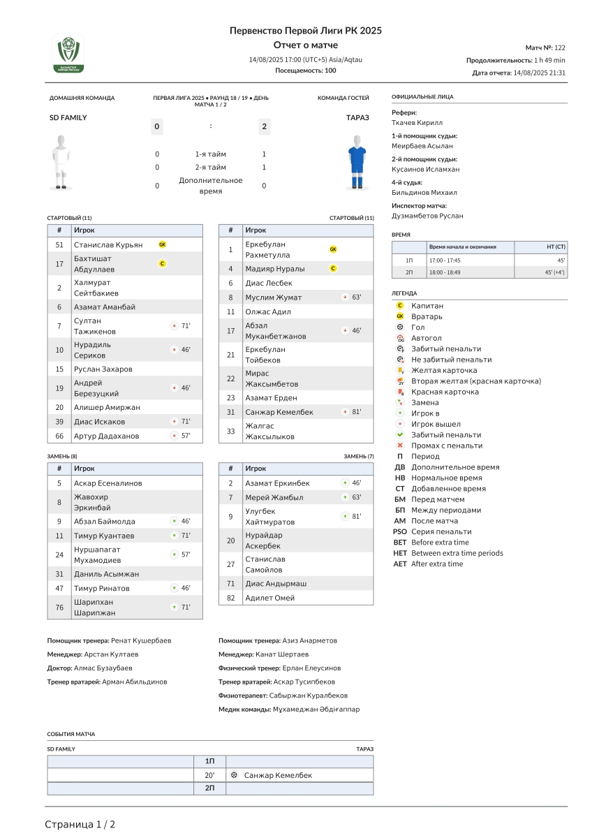 «SD Family» Астана - «Тараз» Тараз - 0:2