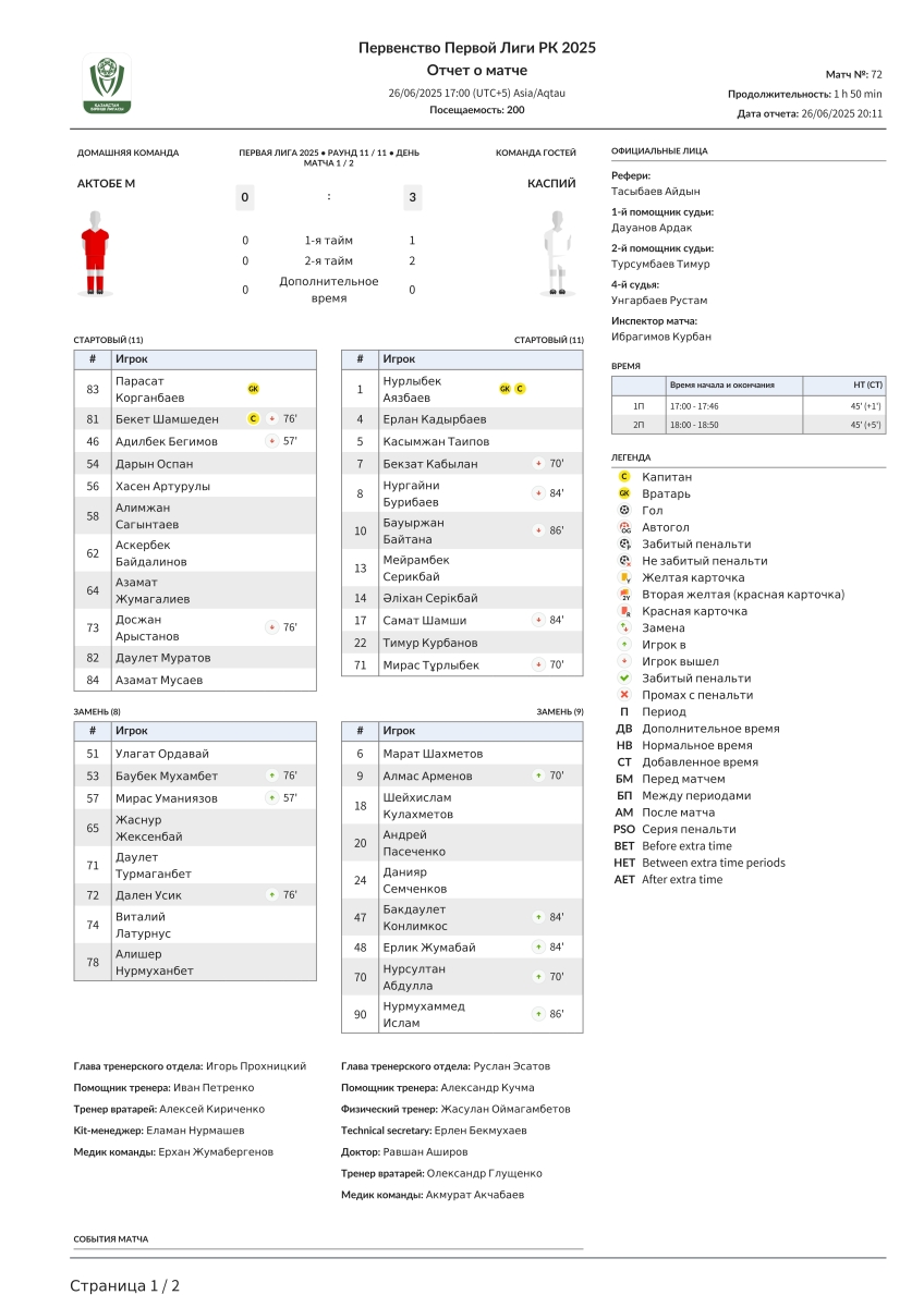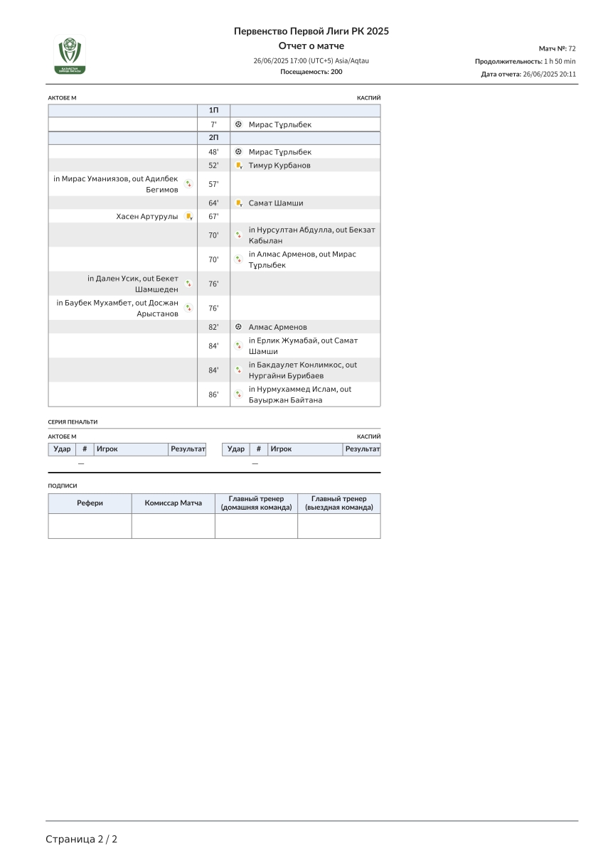 «Актобе U-21» Актобе - «Каспий» Актау - 0:3