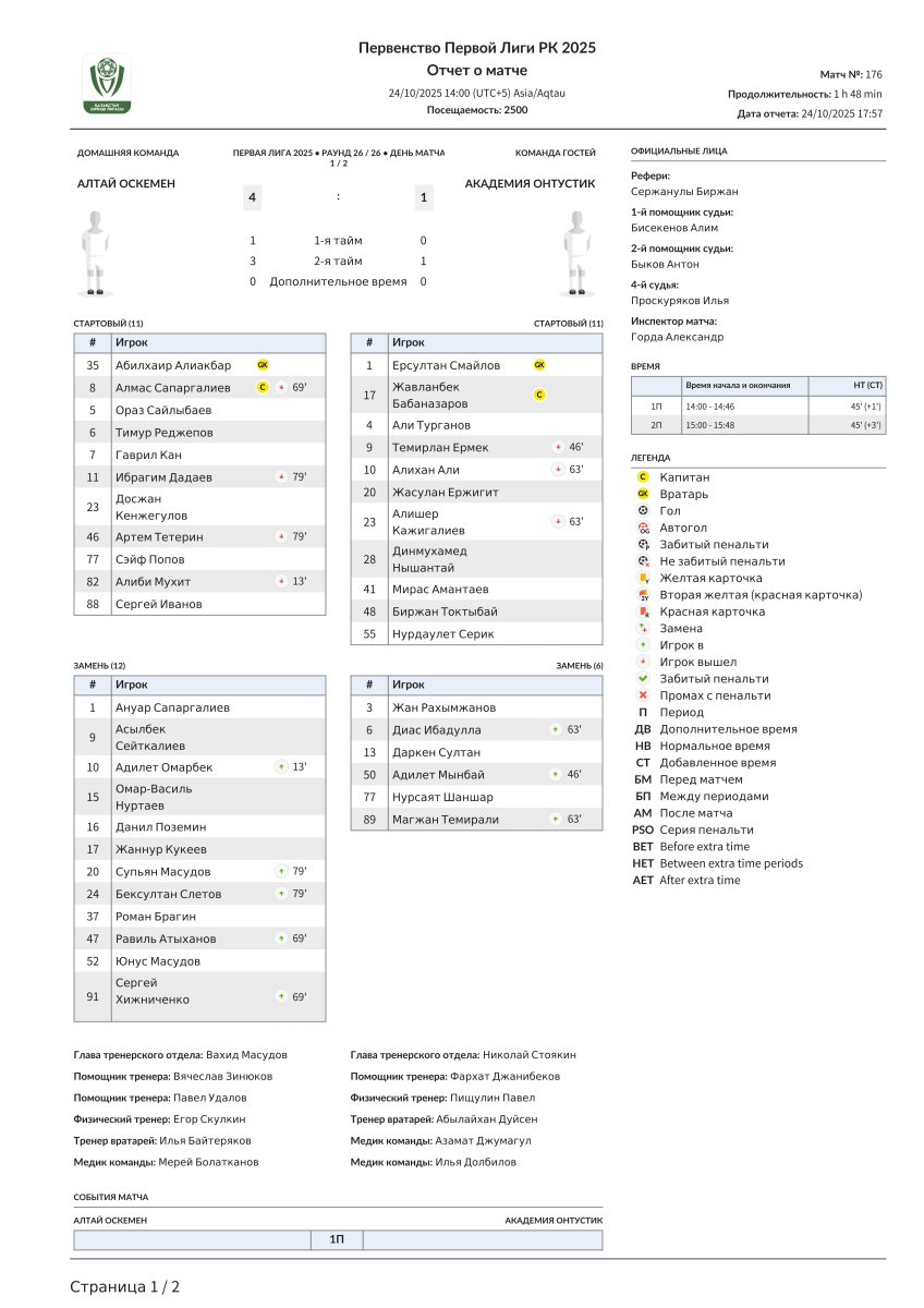 «Алтай» Усть-Каменогорск - «Академия Онтүстик» Чимкент - 4:1
