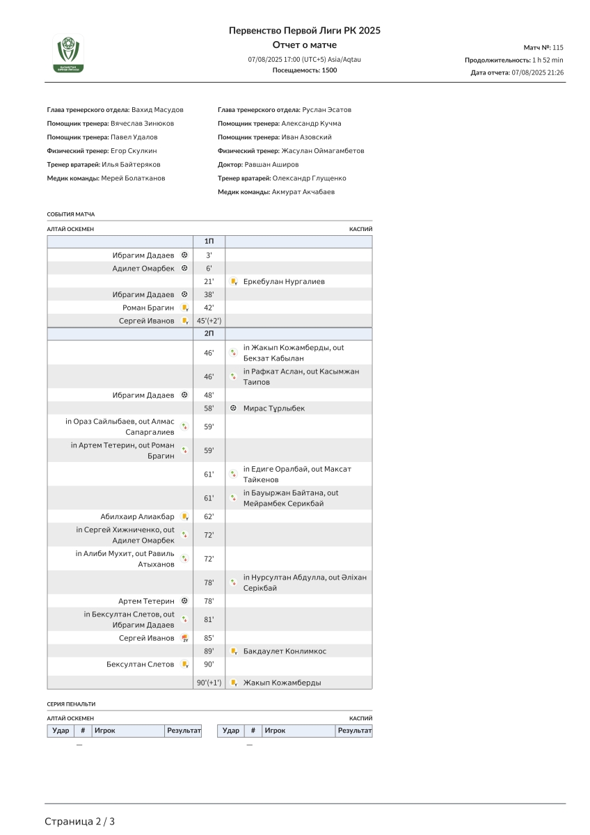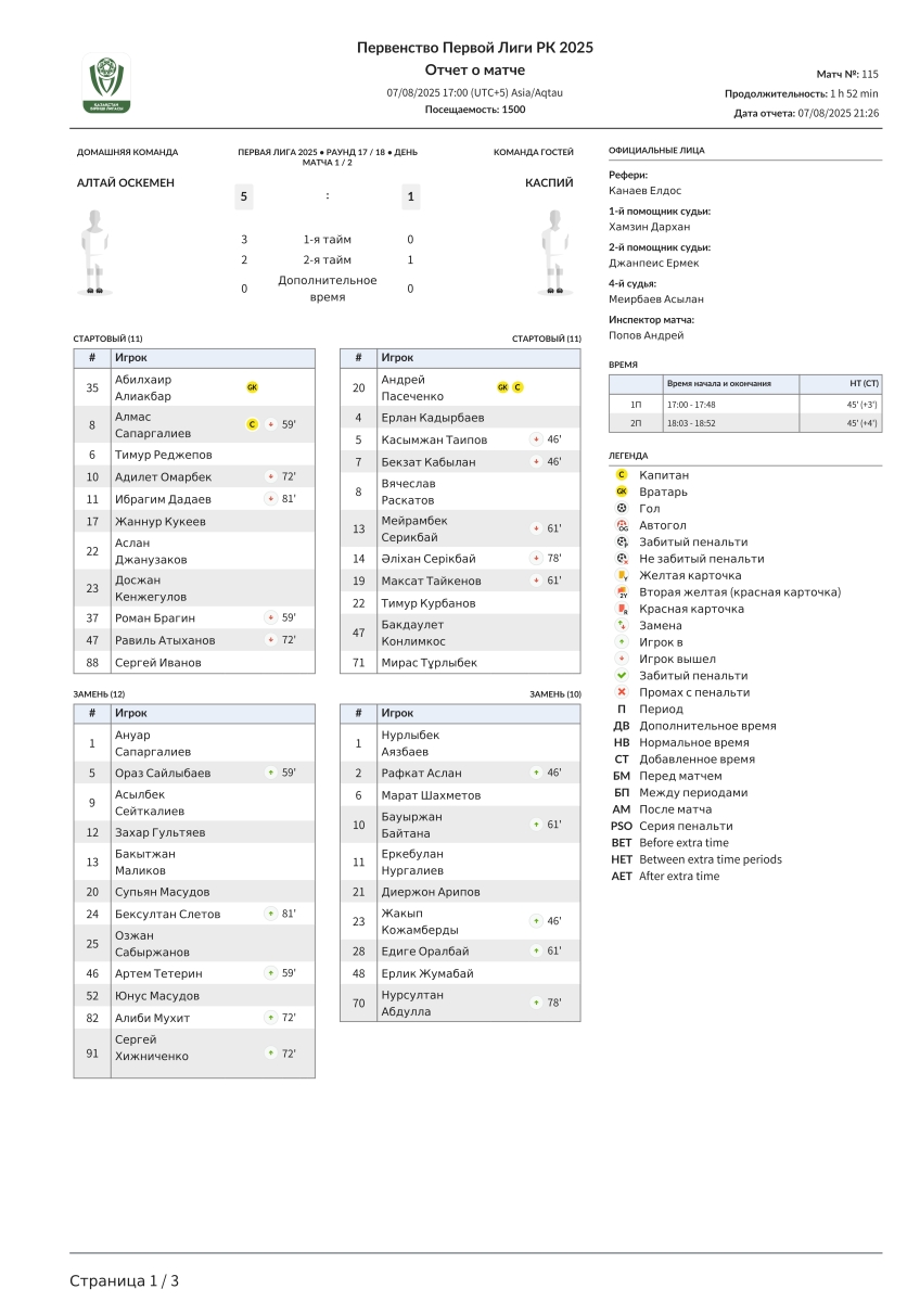 «Алтай» Усть-Каменогорск - «Каспий» Актау - 5:1