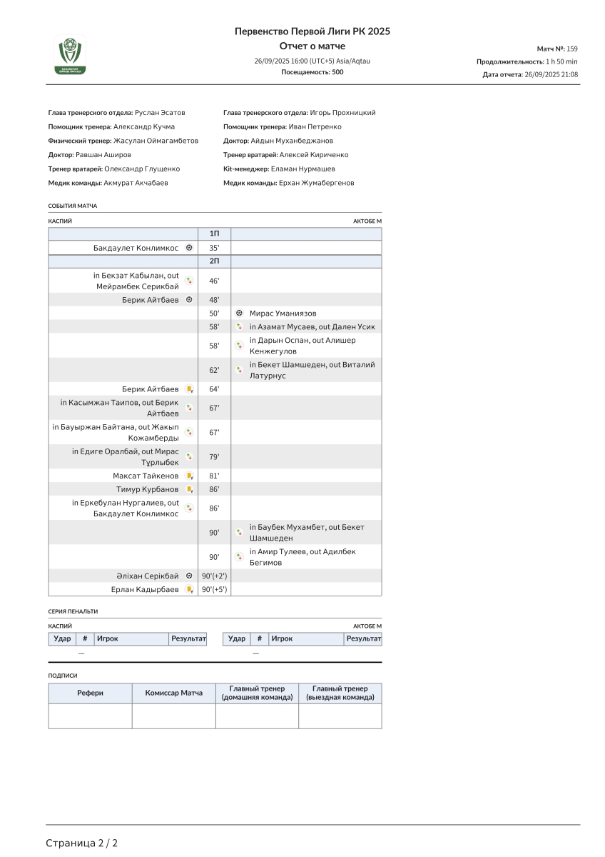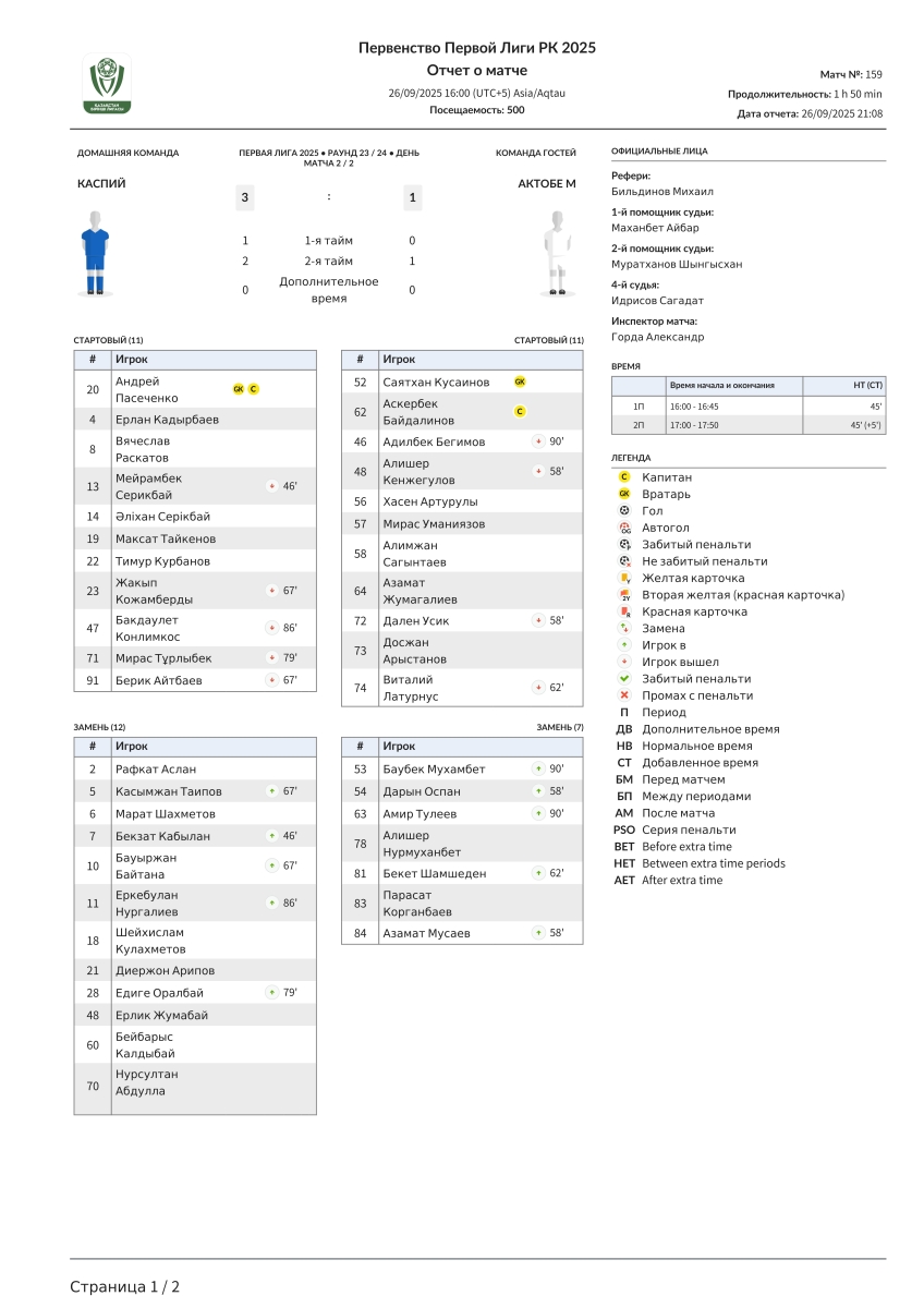 «Каспий» Актау - «Актобе U-21» Актобе - 3:1