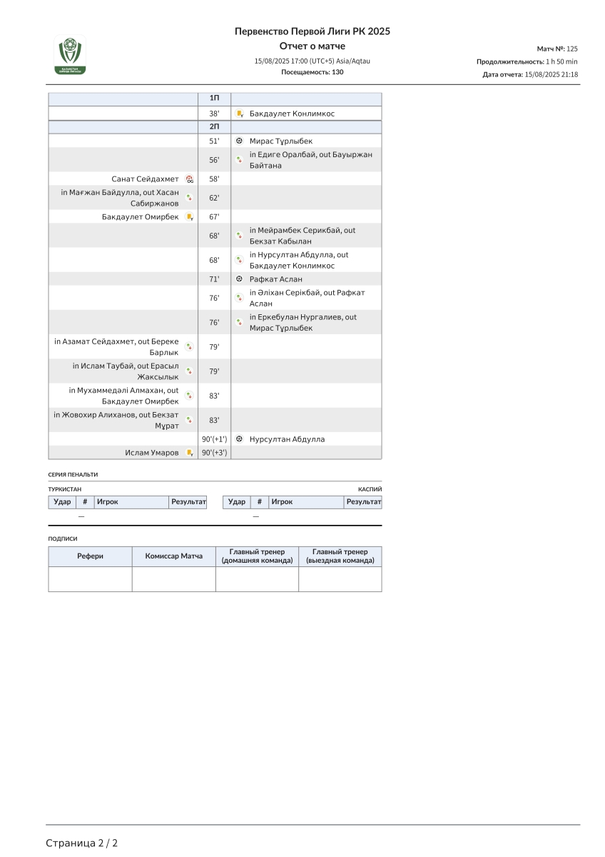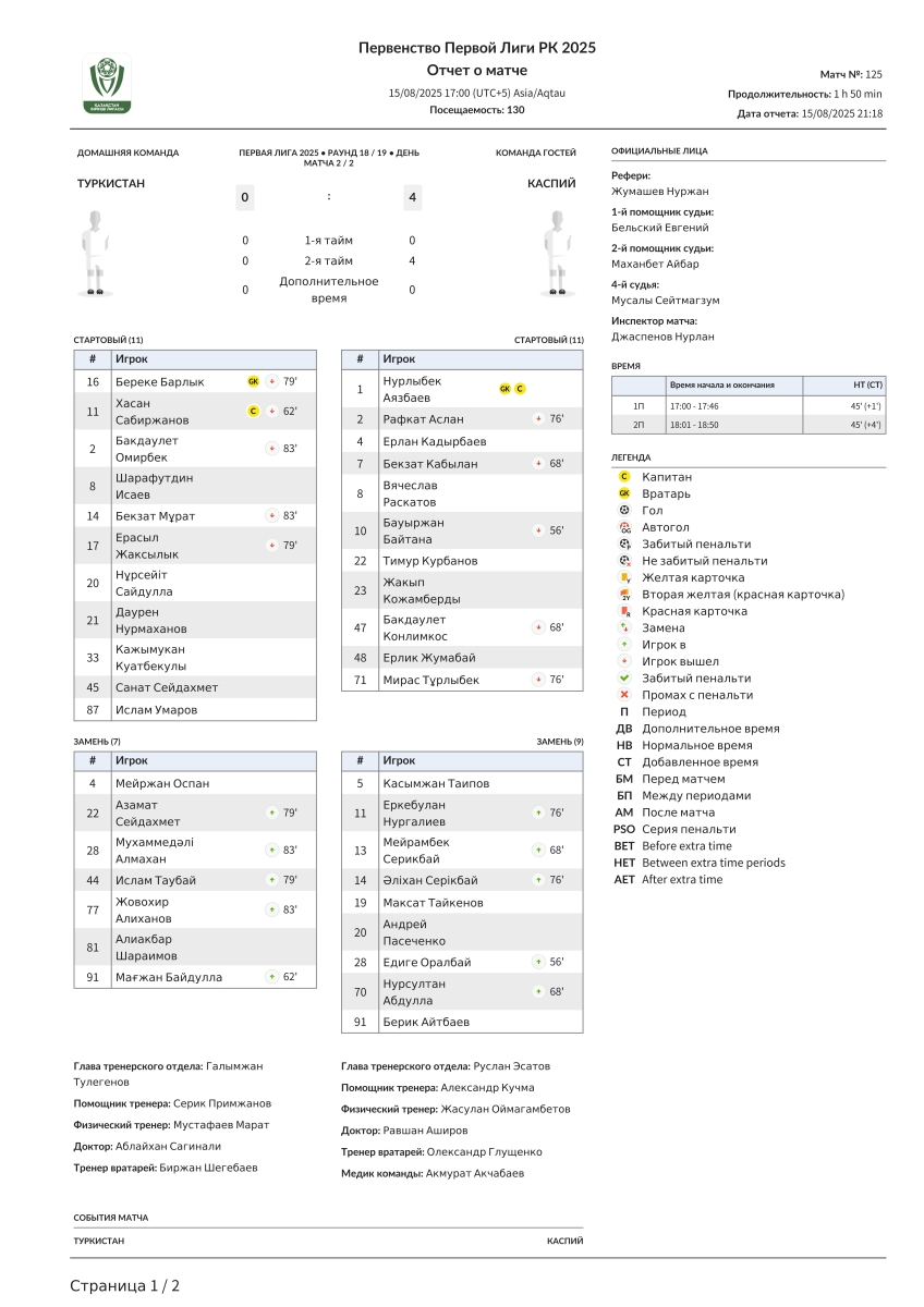 «Туркестан» Туркестан - «Каспий» Актау - 0:4
