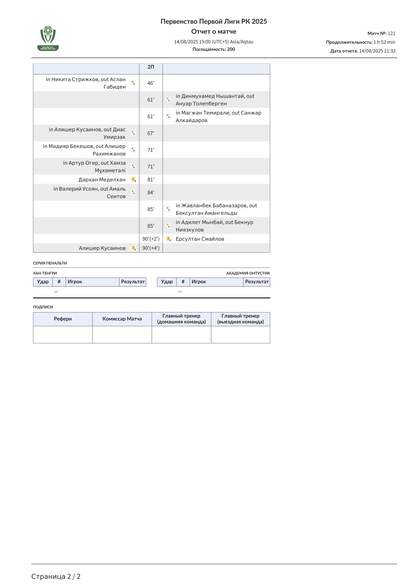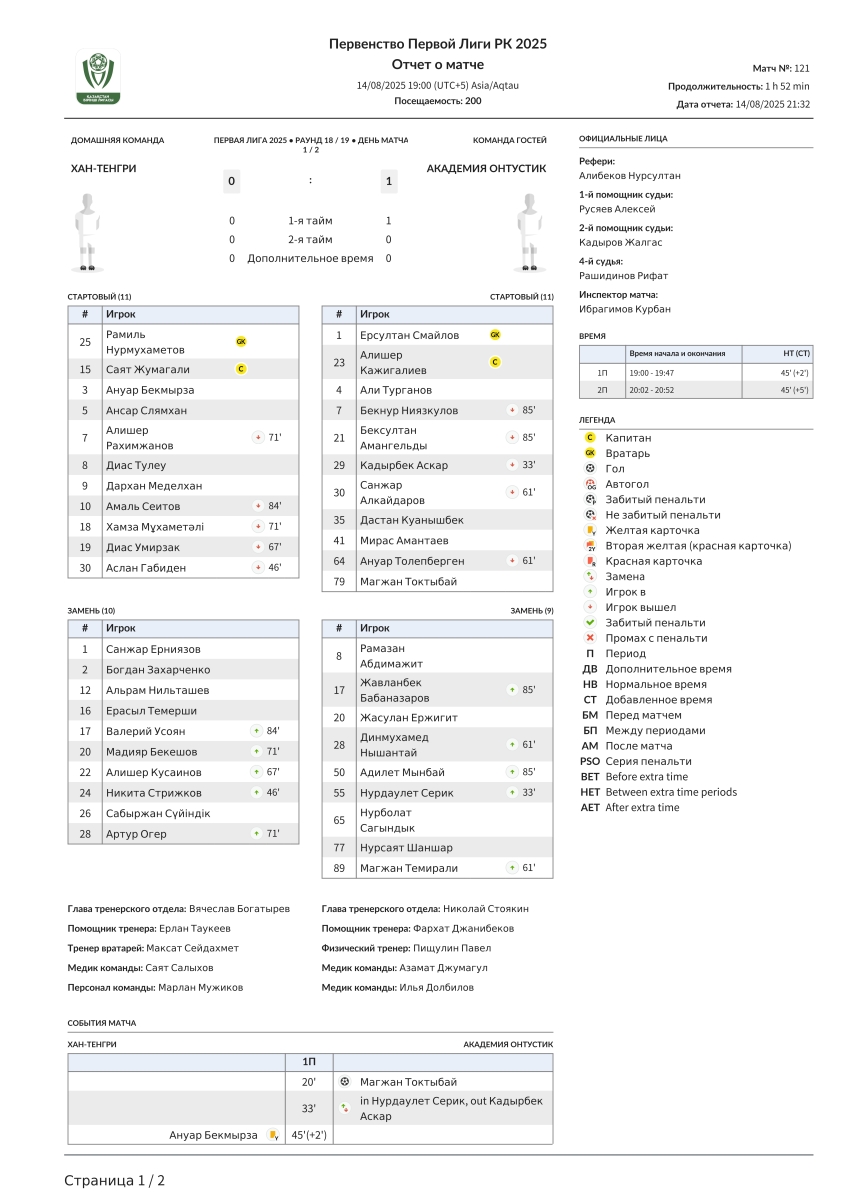 «Хан-Тенгри» Алма-Ата - «Академия Онтүстик» Чимкент - 0:1