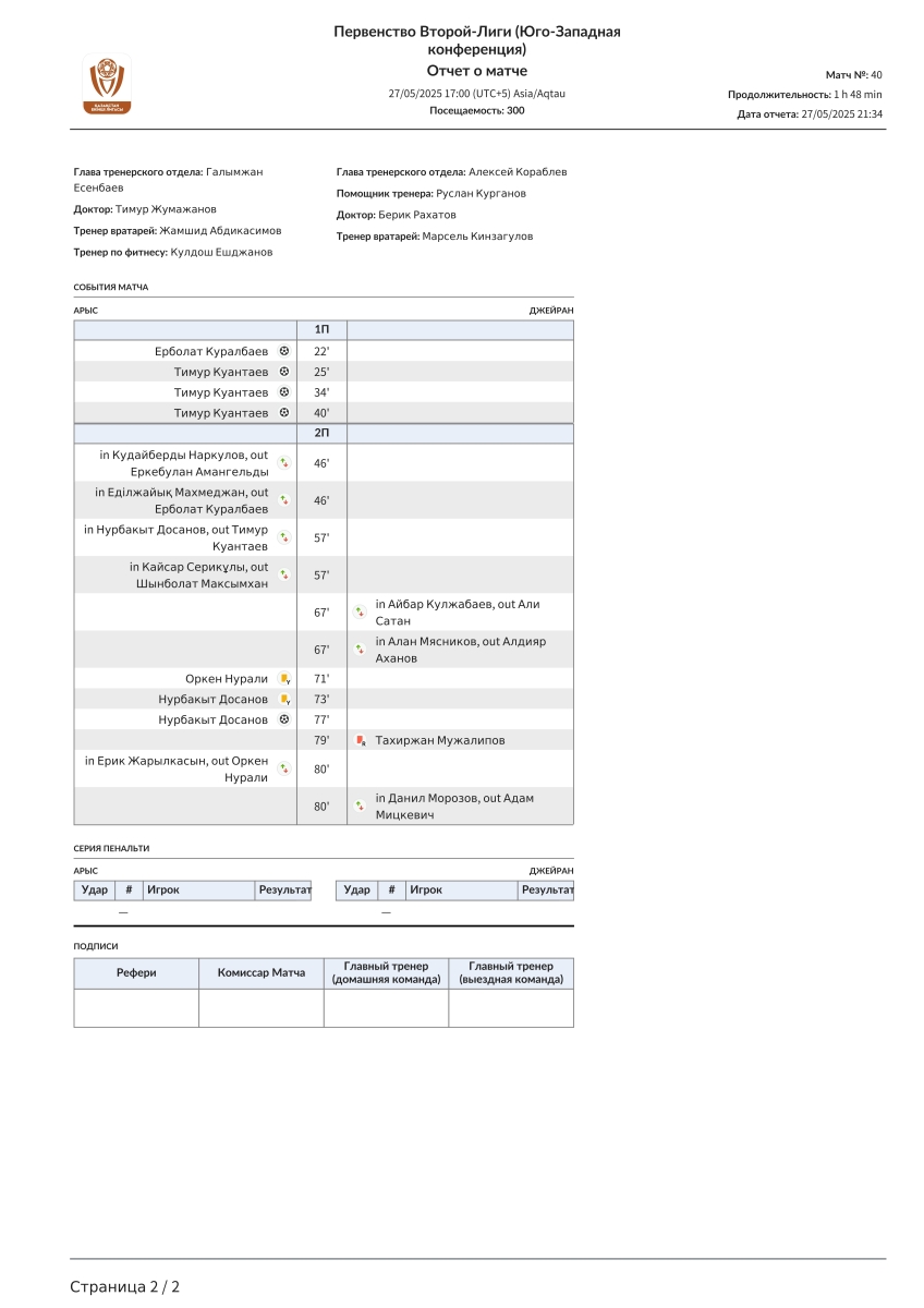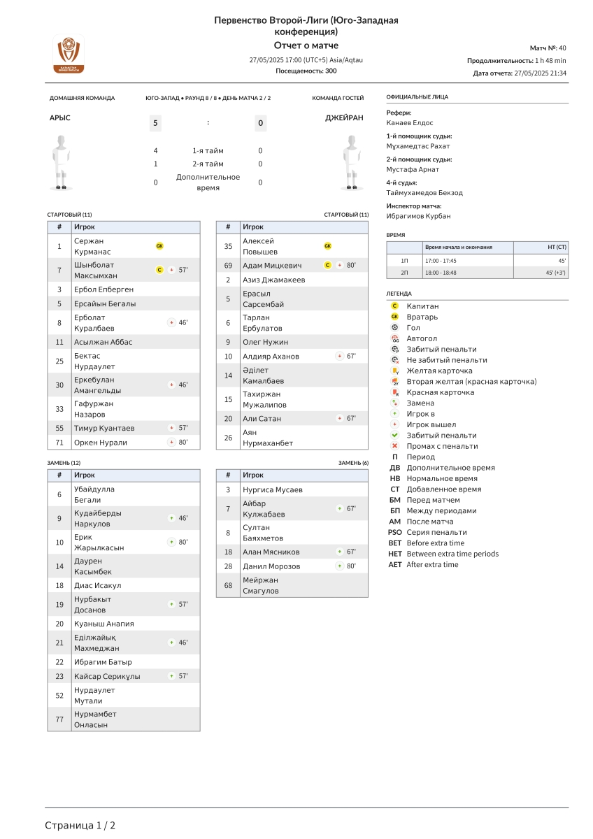«Арысь» Арысь - «Джейран» Алма-Ата - 5:0