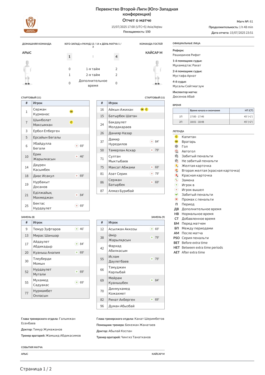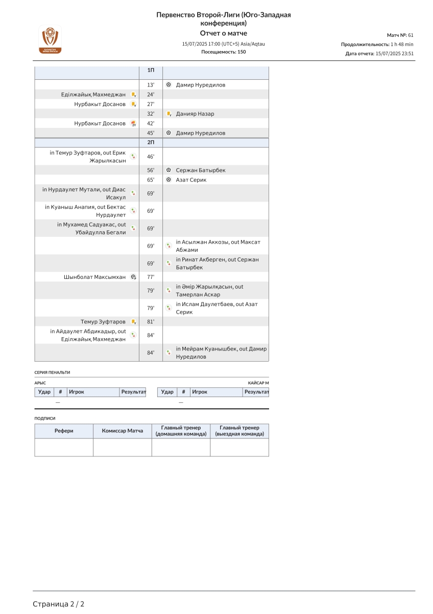 «Арысь» Арысь - «Кайсар-М» Кзыл-Орда - 1:4