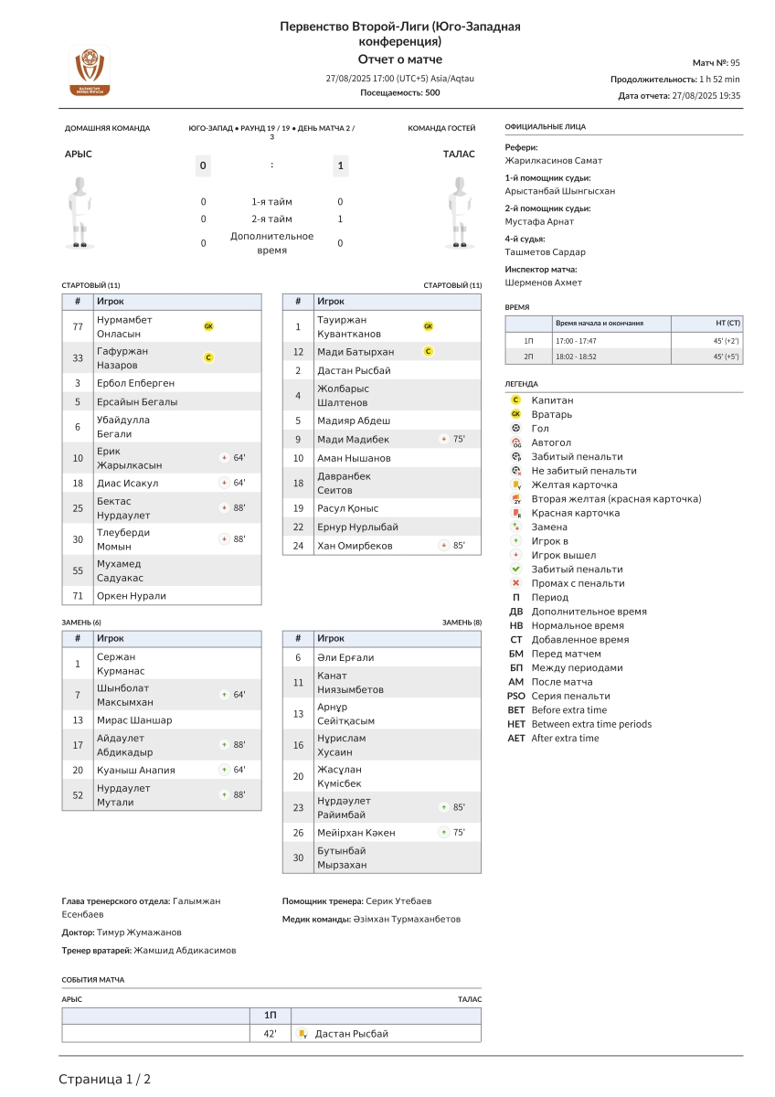 «Арысь» Арысь - «Талас» Каратау - 0:1