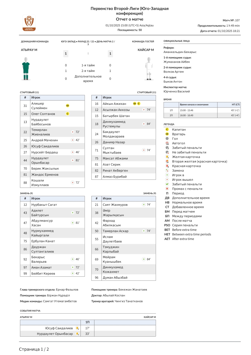 «Атырау U-21» Атырау - «Кайсар-М» Кзыл-Орда - 1:1