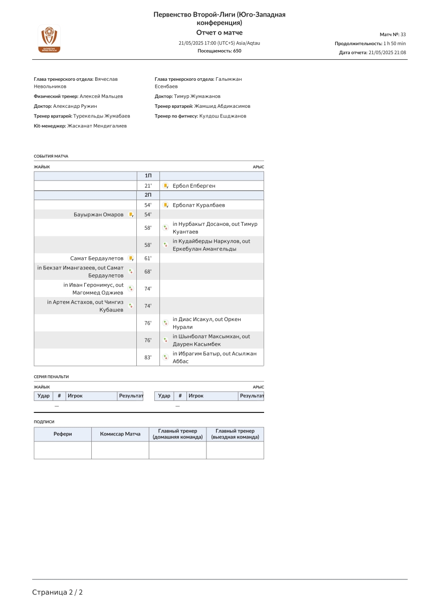 «Жайык» Уральск - «Арысь» Арысь - 0:0
