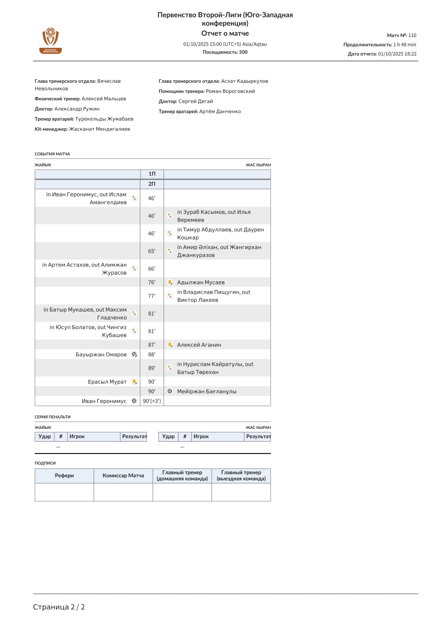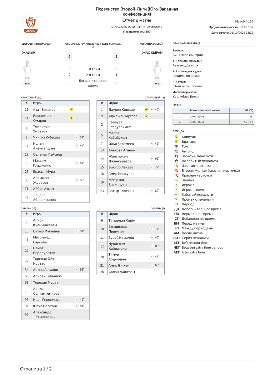 «Жайык» Уральск - «Жас Кыран» Алма-Ата - 2:1