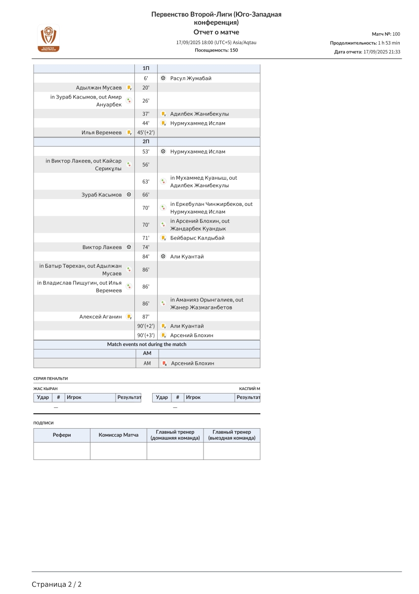 «Жас Кыран» Алма-Ата - «Каспий»-М Актау - 2:3