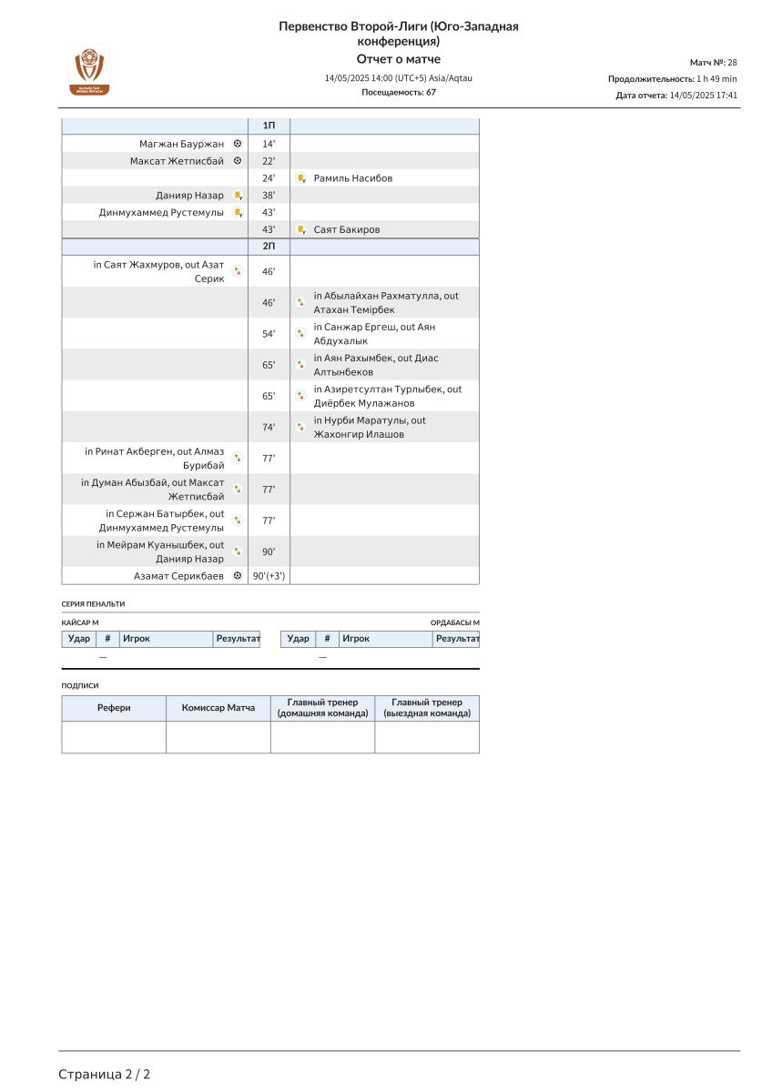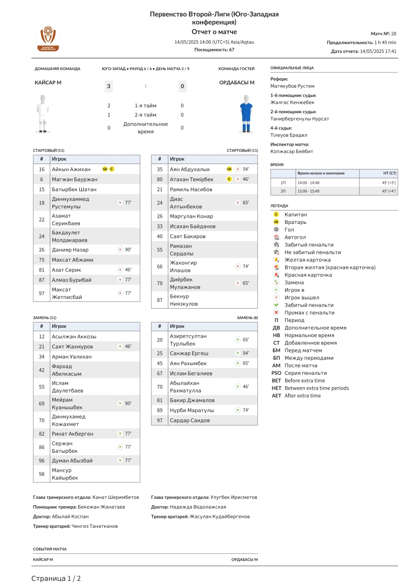«Кайсар-М» Кзыл-Орда - «Ордабасы U-21» Чимкент - 3:0