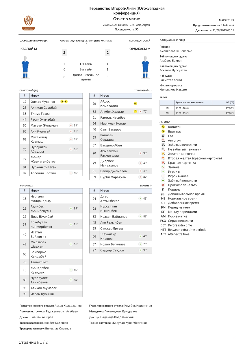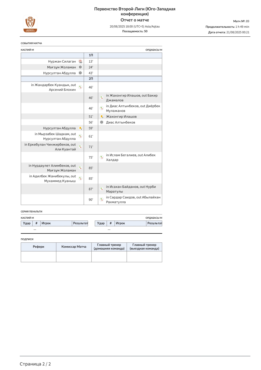 «Каспий»-М Актау - «Ордабасы U-21» Чимкент - 2:2