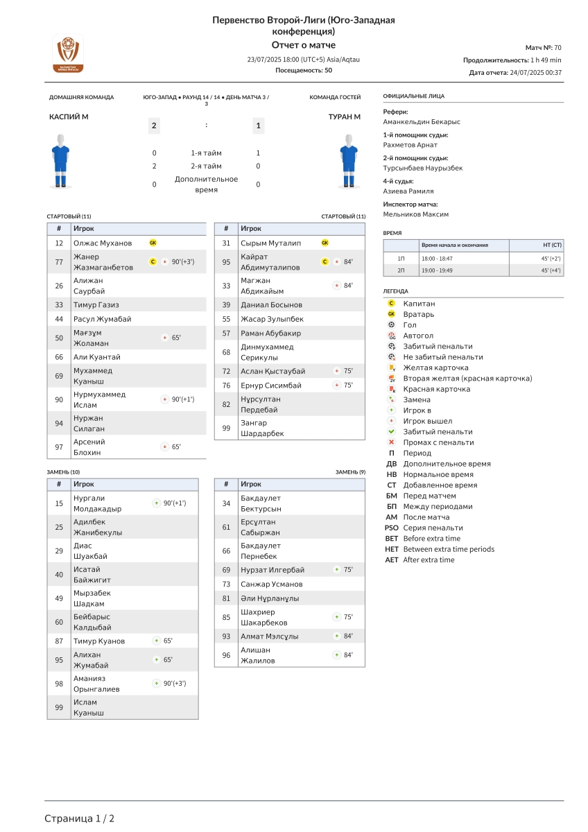 «Каспий»-М Актау - «Туран-М» Туркестан - 2:1