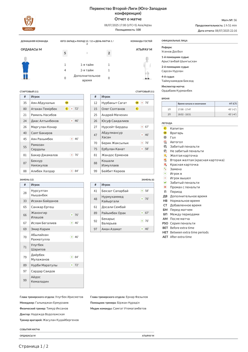 «Ордабасы U-21» Чимкент - «Атырау U-21» Атырау - 5:2